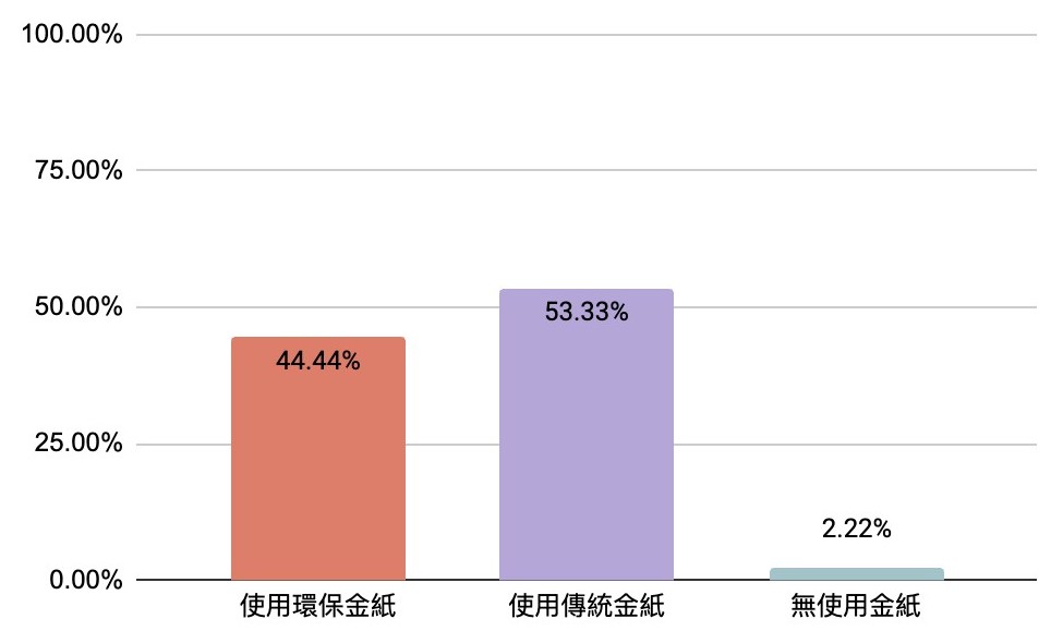 翌順軒宗教藝術文化用品店的老闆娘提到,雖然還是有人認為環保金紙「份量」沒有傳統多,但大部分的客人會直接指定要購買環保紙錢或環保香,甚至很多老一輩的香客也為了環保開始減低購買金紙的數量。