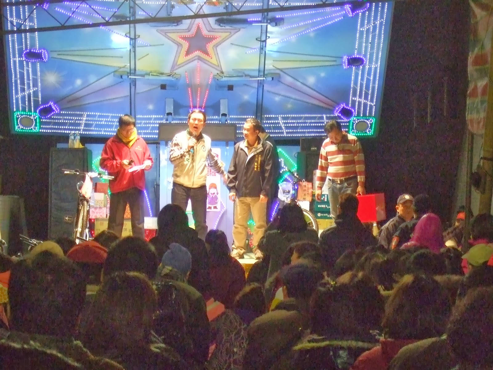 為躲避連綿細雨,廣場裡架起遮雨棚,男女老少一同聚集於場內,遮雨棚下還貼心地提供將近百張座椅,讓參與的人不因站立而腳痠,聽著里長等人致詞,現場笑鬧不斷,氣氛熱鬧非凡。而當晚,最讓人期待的莫過於抽獎活動,最大獎為腳踏車,數量高達十七部,讓參加的民眾個個都摩拳擦掌,滿心期待地將粉色的抽獎聯丟入抽獎箱內,期望能將優渥的獎品帶回家。
