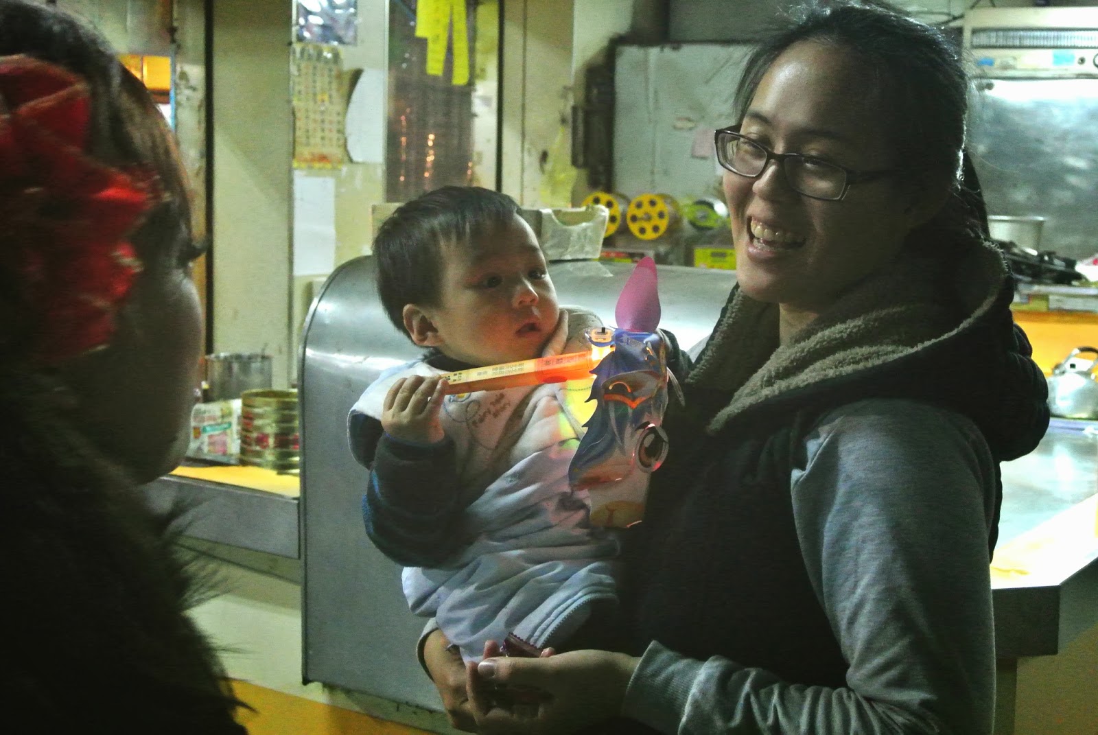 「元宵節快樂!新年快樂!馬上有錢!」踩街的吆喝聲迴盪在立功里的大街小巷,一邊由志工媽媽們發送糖果及自製的手提紙燈籠,溫暖了小雨陰綿的元宵。