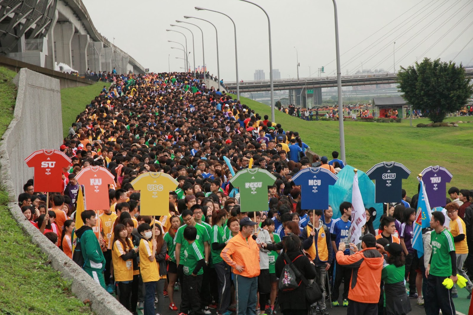 北台灣七大學聯合路跑賽三月九日上午於新莊幸福水漾公園開跑,東吳、輔仁、實踐、文化、銘傳、世新、淡江七所大學的學生、師長及校友,分別穿著紅、橙、黃、綠、藍、靛、紫七種顏色的衣服參賽,將整個場地妝點得七彩繽紛、熱鬧非凡。