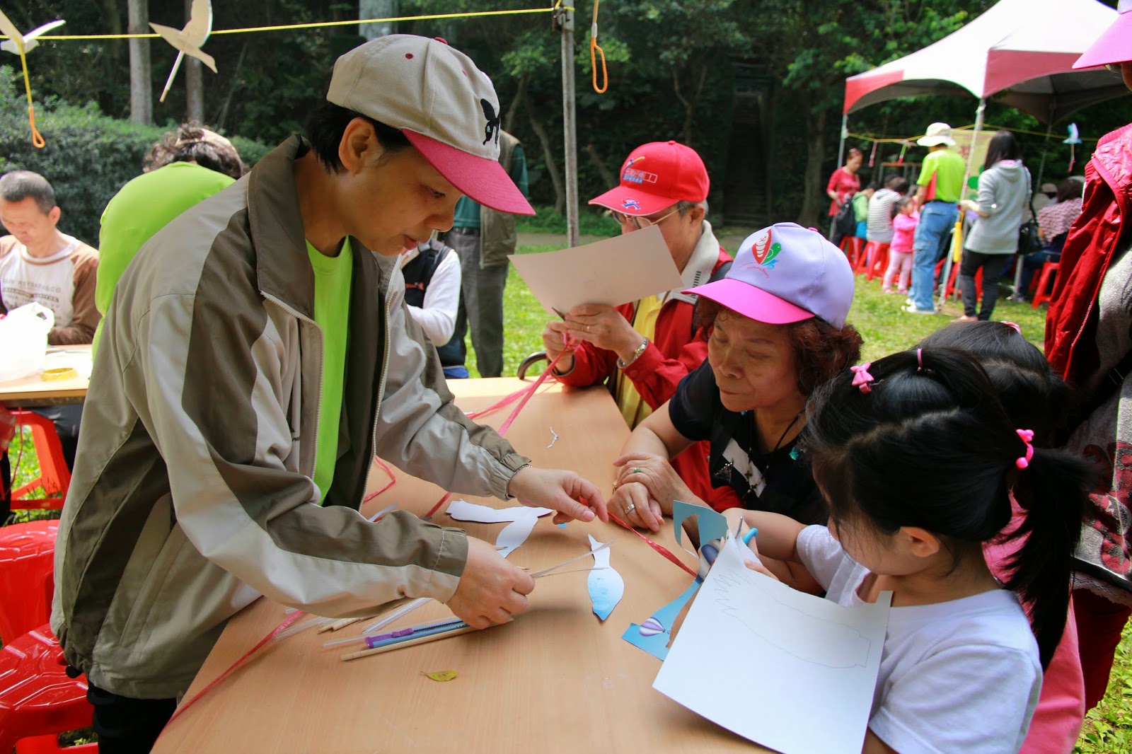▲剪紙站的志工耐心指導著民眾利用廢紙板剪出美麗的鳥,也讓親子互動增進情感。 攝影/李珮綺