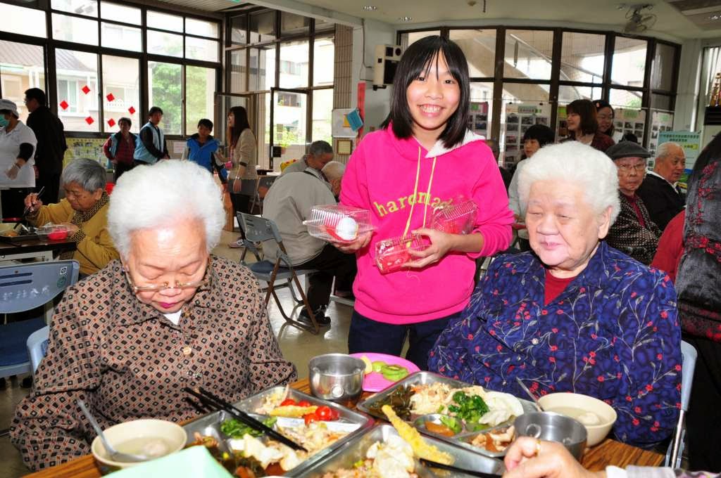 ▲愛心育幼院院童造訪老人公寓,幫阿公阿嬤打菜。 新北市政府社會局提供