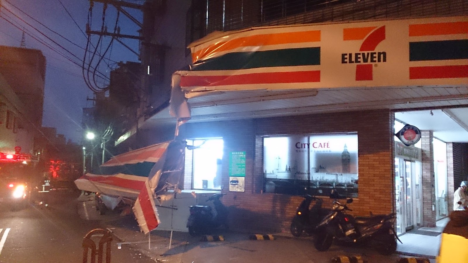 新北市消防局第二大隊福營分隊四月十六日晚間六時接獲民眾報案,有貨車撞掉超商招牌,招牌卡在電線上懸浮在半空。消防人員到現場後立即通知台電人員,由台電人員判斷該電線是否有電,並架設封鎖繩劃定警戒區。
