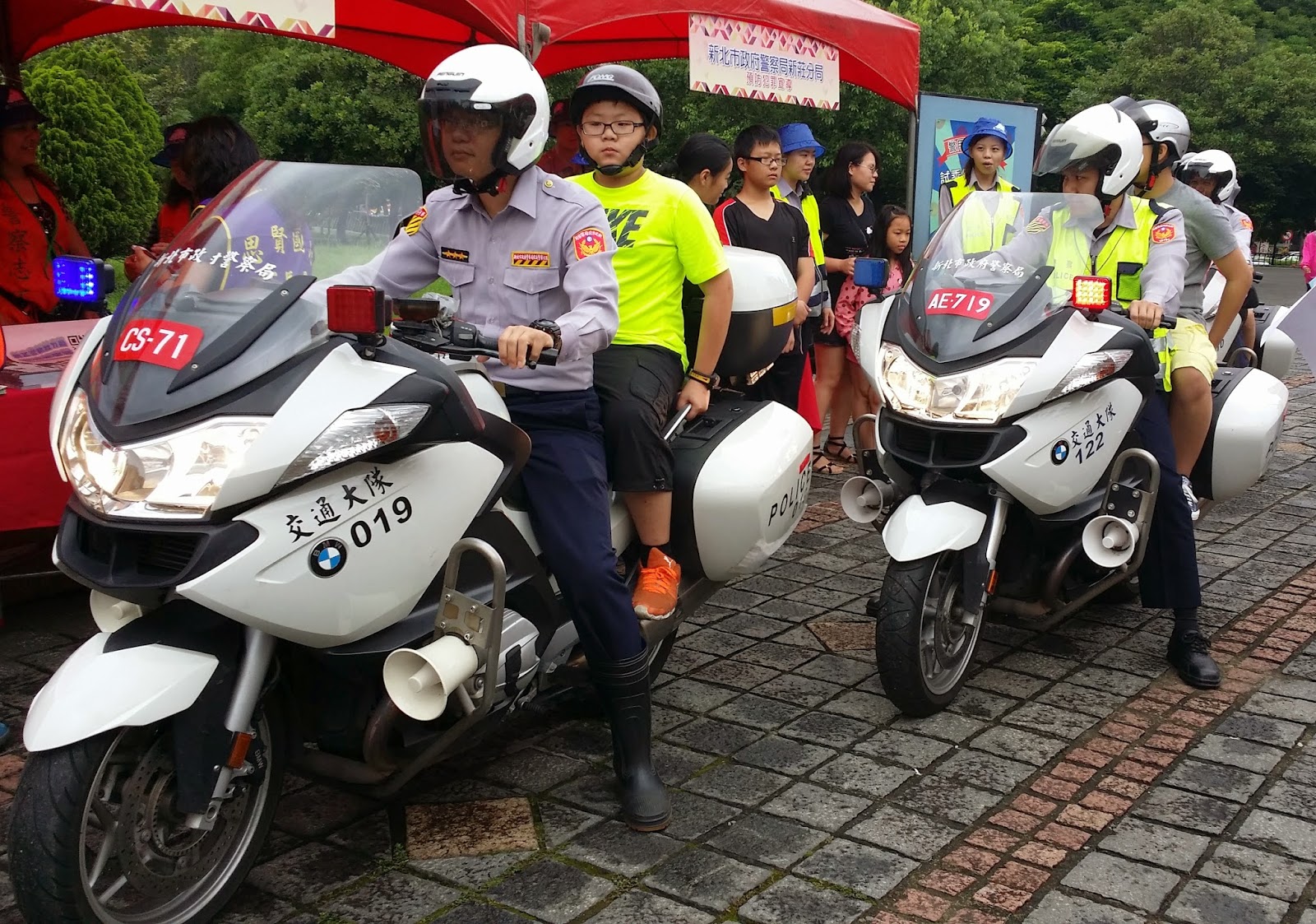 乘坐警用重機活動於上午九時開始,現場共有三部警用重機,民眾依序排隊,由各派出所支援警力替民眾配戴安全帽,並同時宣導配戴安全帽的重要性。從攤位出發後,繞行田徑場一周,約五分鐘。後來雖因雨勢變大,活動暫停,但民眾皆耐心等候。第一批乘坐的民安國小二年級洪小弟弟表示:「第一次坐這麼大的車,雖然全身都濕了,還想再坐一次。」此體驗不分老少,且乘坐完後還可獲得「平安龜」手電筒吊飾一個。