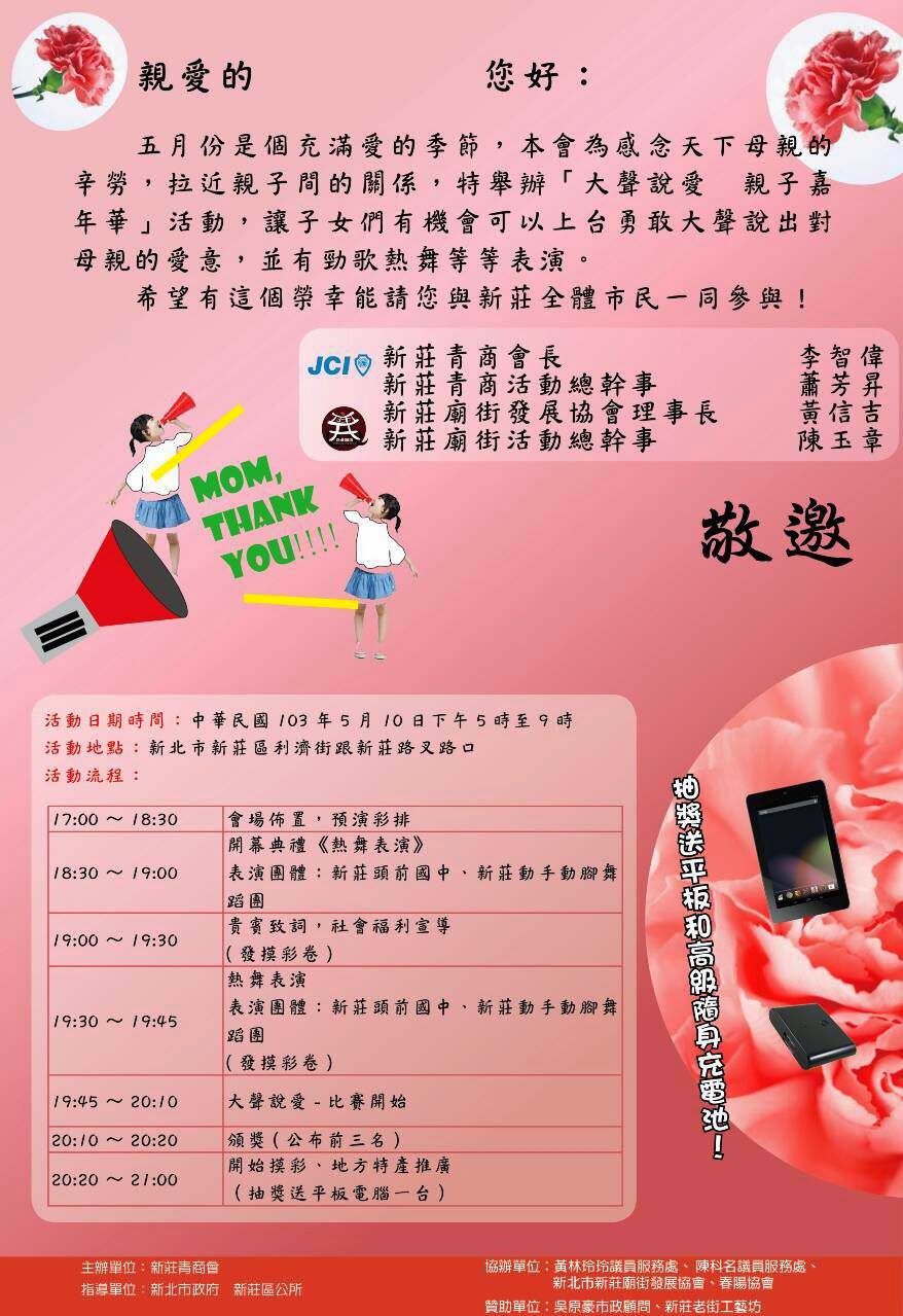 【記者劉曉潔報導】新莊青商會為了迎接母親節的到來,五月十日在新莊廟街舉辦「大聲說愛」親子嘉年華活動,在現場將有大聲公比賽,邀請子女上台參加,大聲喊出對母親的愛,獎品豐富,歡迎新莊居民踴躍參加。