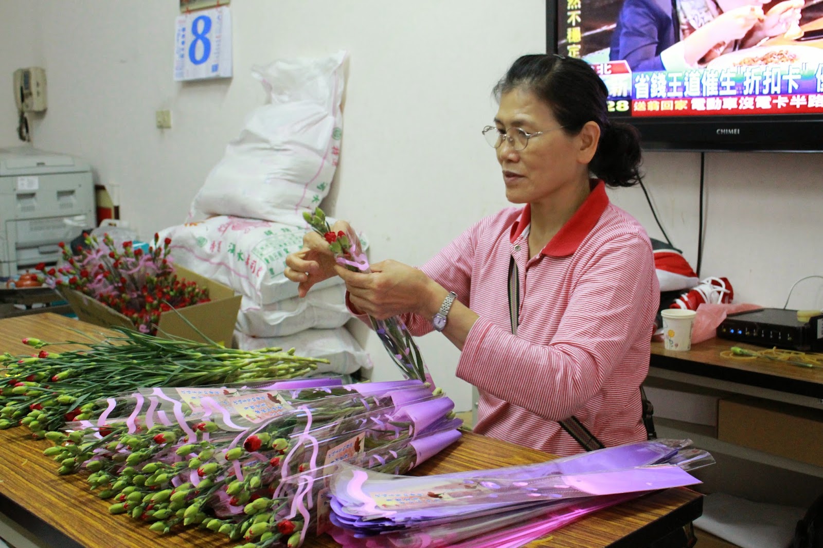 ▲義工與鄰長們一支支地將康乃馨精美包裝後,發給每一戶里民。 攝影/陳奕伶