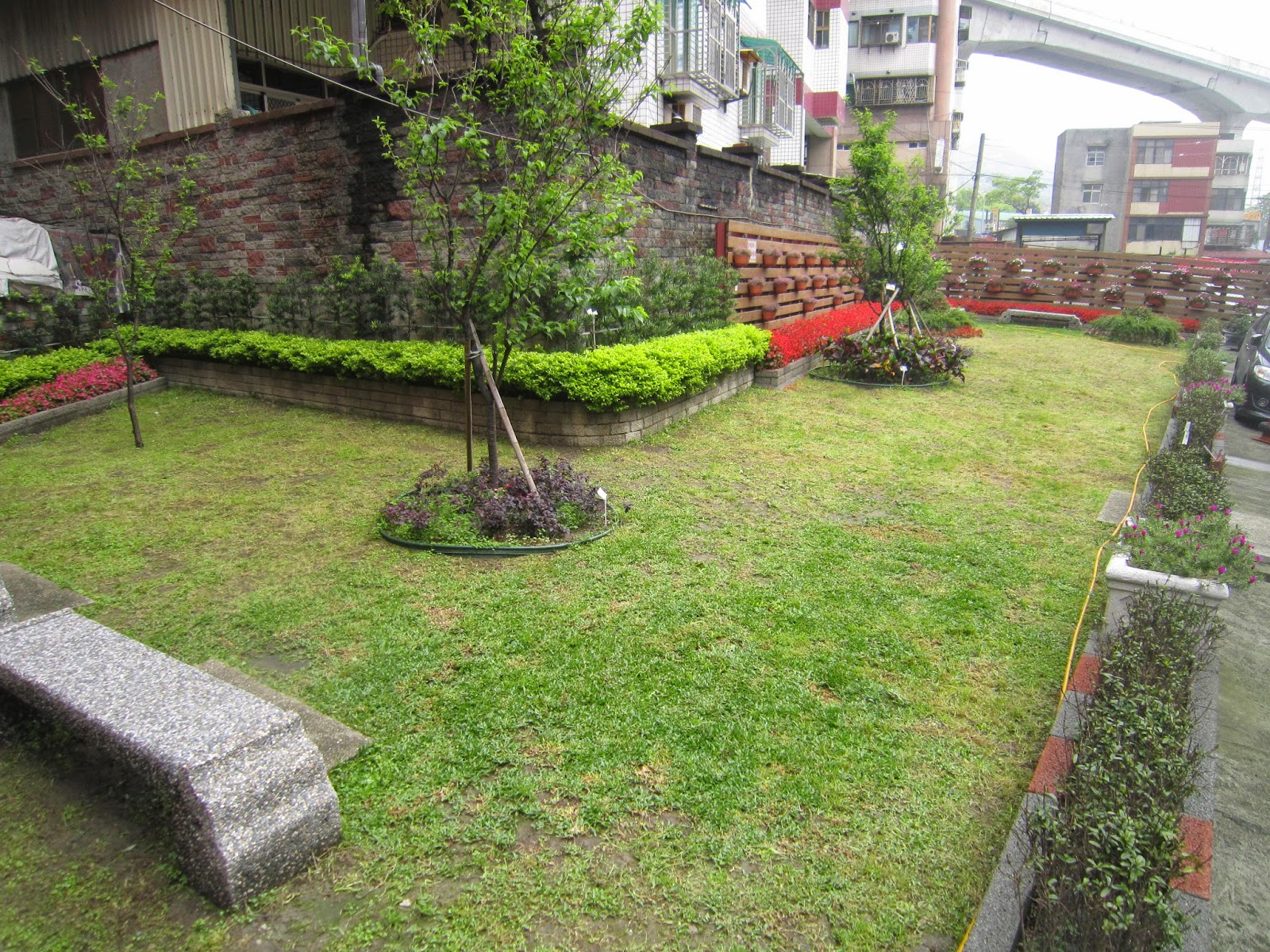 「小花園」現在是提供里內年長者休憩聊天、小朋友跑跳玩耍的地方。綠油油的草皮上種著樹、兩旁則種五彩繽紛的花朵。