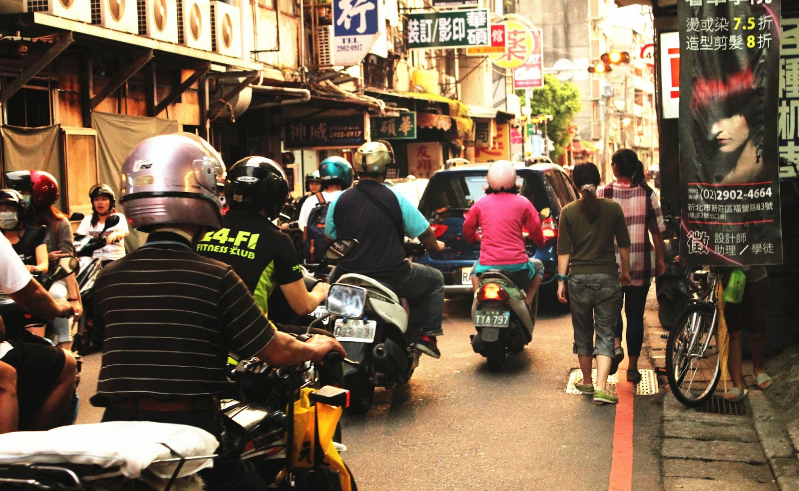道路兩側為紅線,並未規劃人行道,又有許多機車緊鄰路旁違規停靠,造成嚴重的人車爭道問題,險象環生。