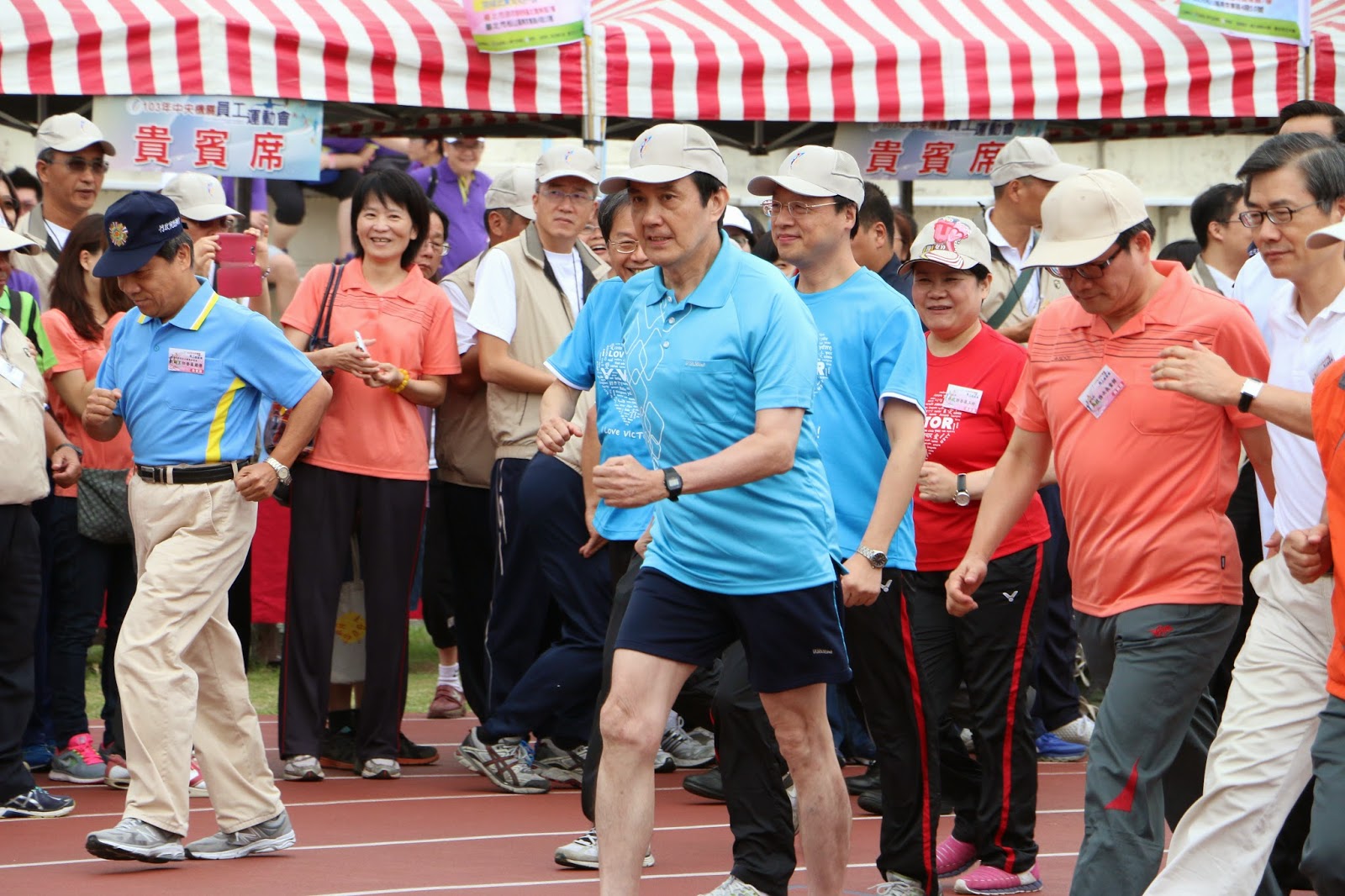 馬總統與江宜樺也下場參加運動會的首場賽事「首長競走比賽」。比賽十時開始,因有各級官員蒞臨,場外八時未到便有層層警力戒備,九時過後便封閉通道,禁止民眾靠近運動場。賽程進行間,維安人員紛紛進入高警備狀態,連周遭有人拿著書籍也受到關注,新北市警察局甚至特地出動五隻警犬到場協助保護首長安全。