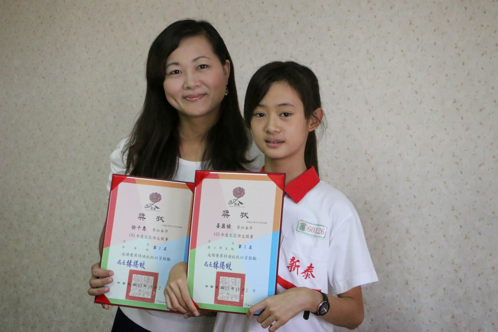 【記者黃詩媛特稿】新泰國小教師徐千惠和六年一班學生姜盈禎,十月二日分別榮獲一○三年度新北市語文競賽北區市賽社會組「作文」第一名,以及國小組第一名。