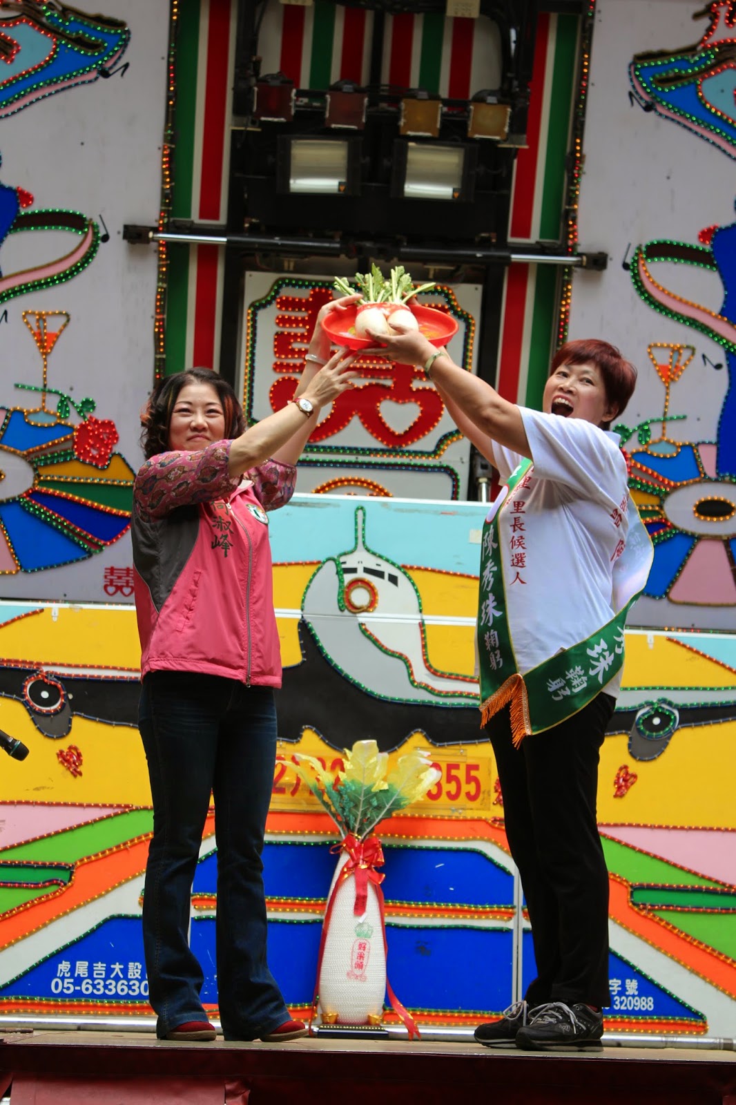 ▲新北市議員何淑峰(左)贈送象徵好彩頭的白蘿蔔給里長候選人陳秀珠(右)。