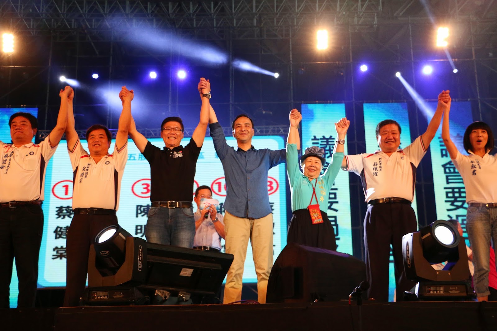 ▲新北市長朱立倫(中)和新北市第二選區國民黨籍議員候選人一起為選戰加油。