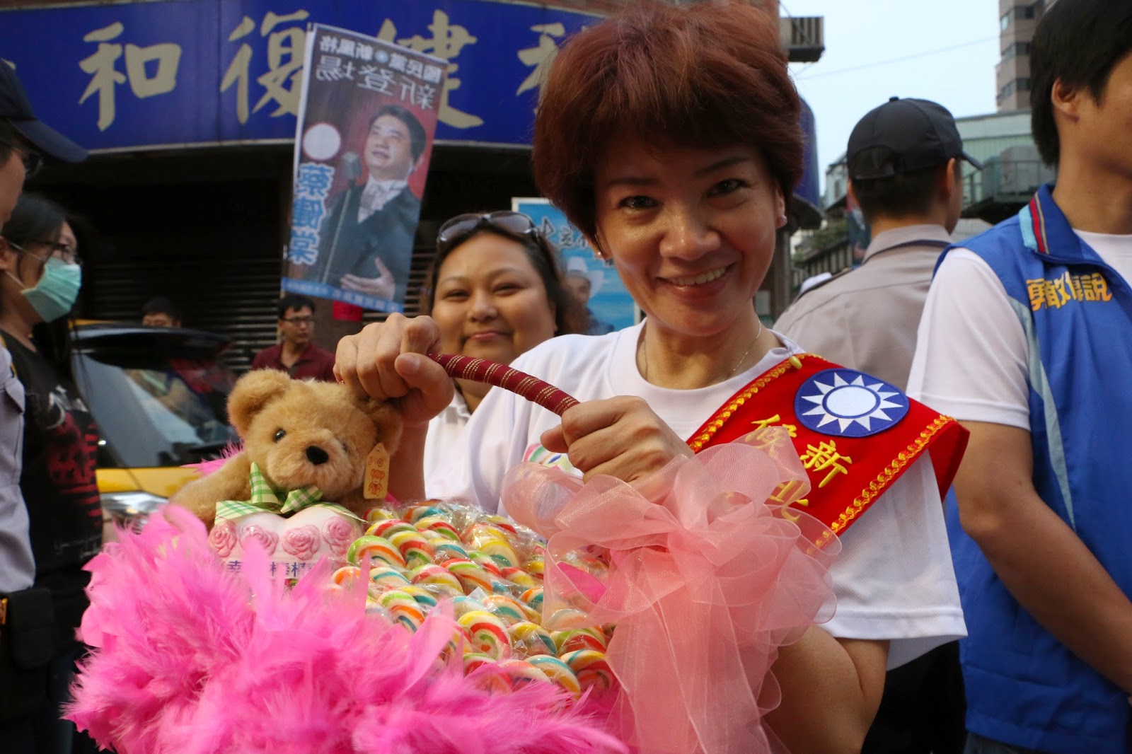 議員蔡健棠夫人鄭玉惠提著棒棒糖發送給選民。