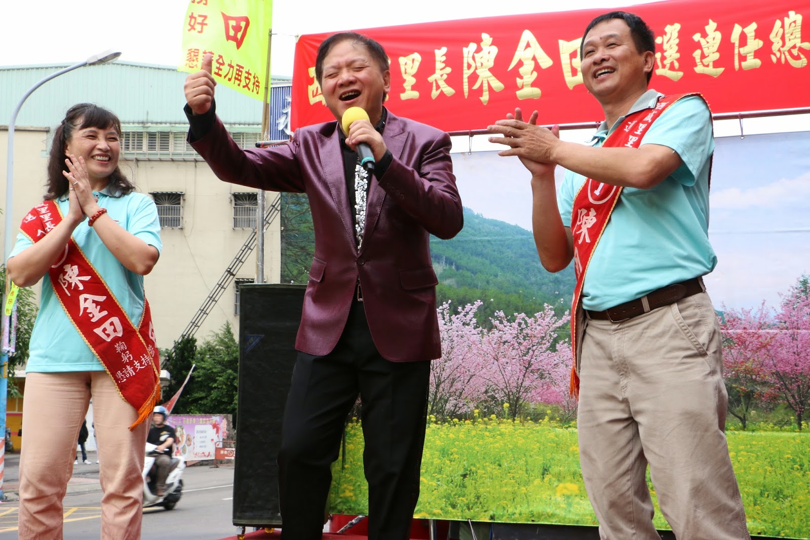 ▲寶島歌王葉啟田在西盛里長陳金田競選總部成立大會上獻聲站台。