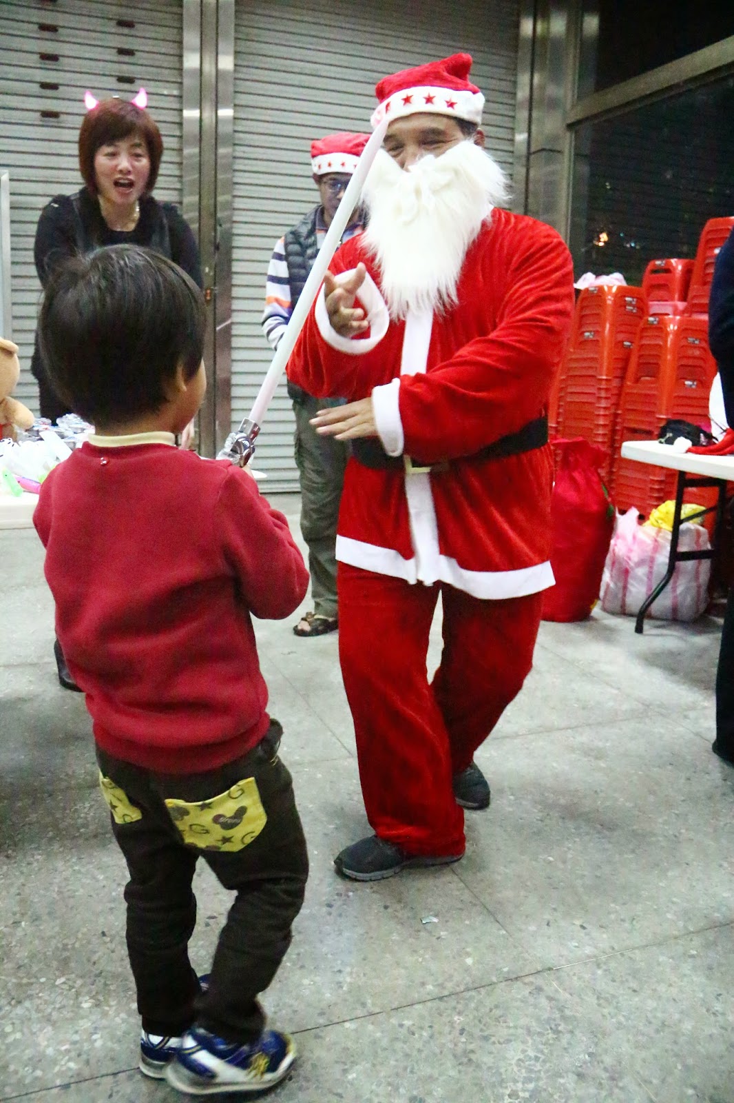 ▲小朋友一拿到玩具劍就和聖誕老人比劃起來