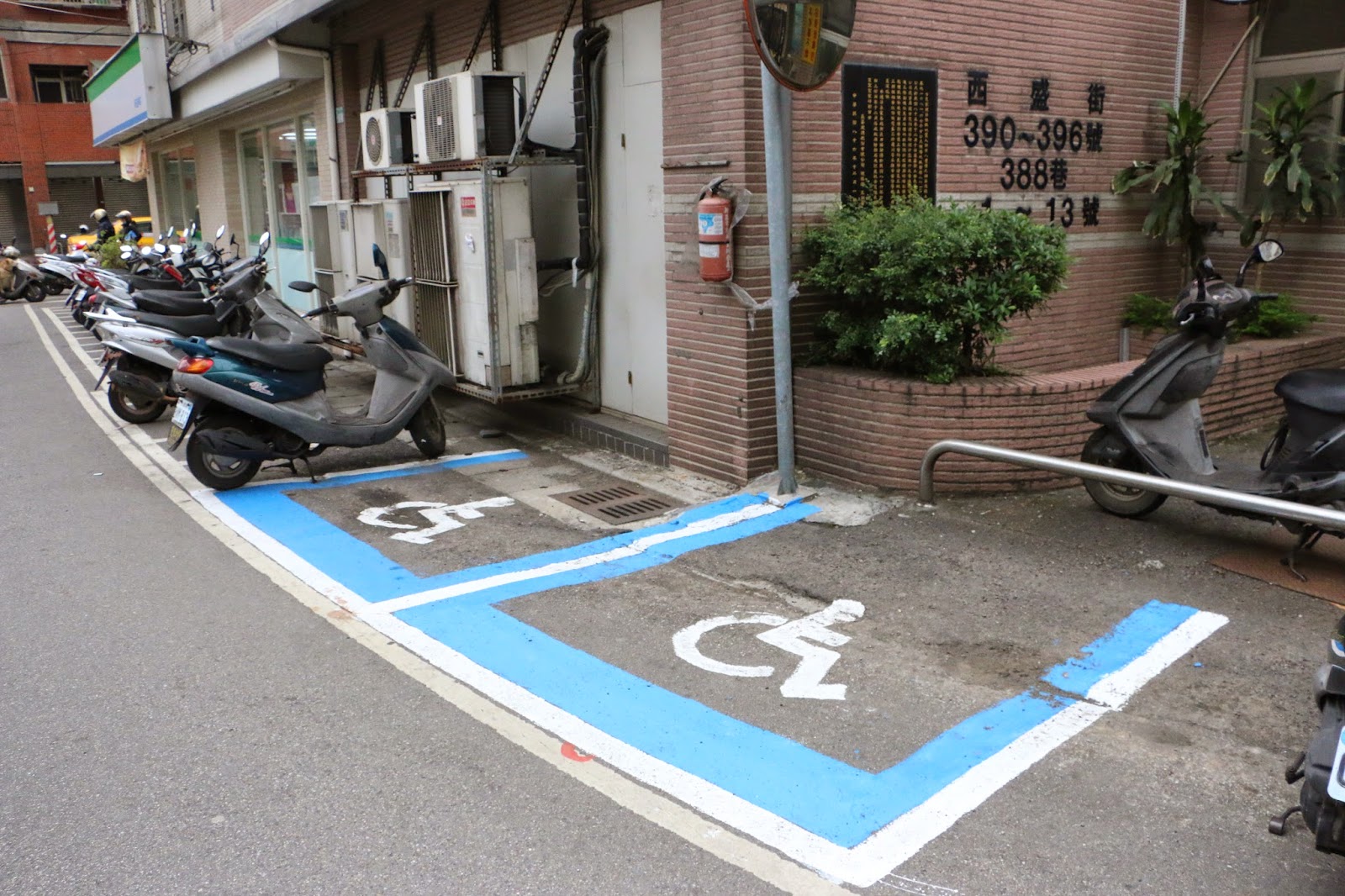 根據大樓管理員陳先生表示,大樓內共有兩名身心障礙者需要停車位,而增設的停車位正好就是兩格,可能是為這兩位身心障礙者所設置的。