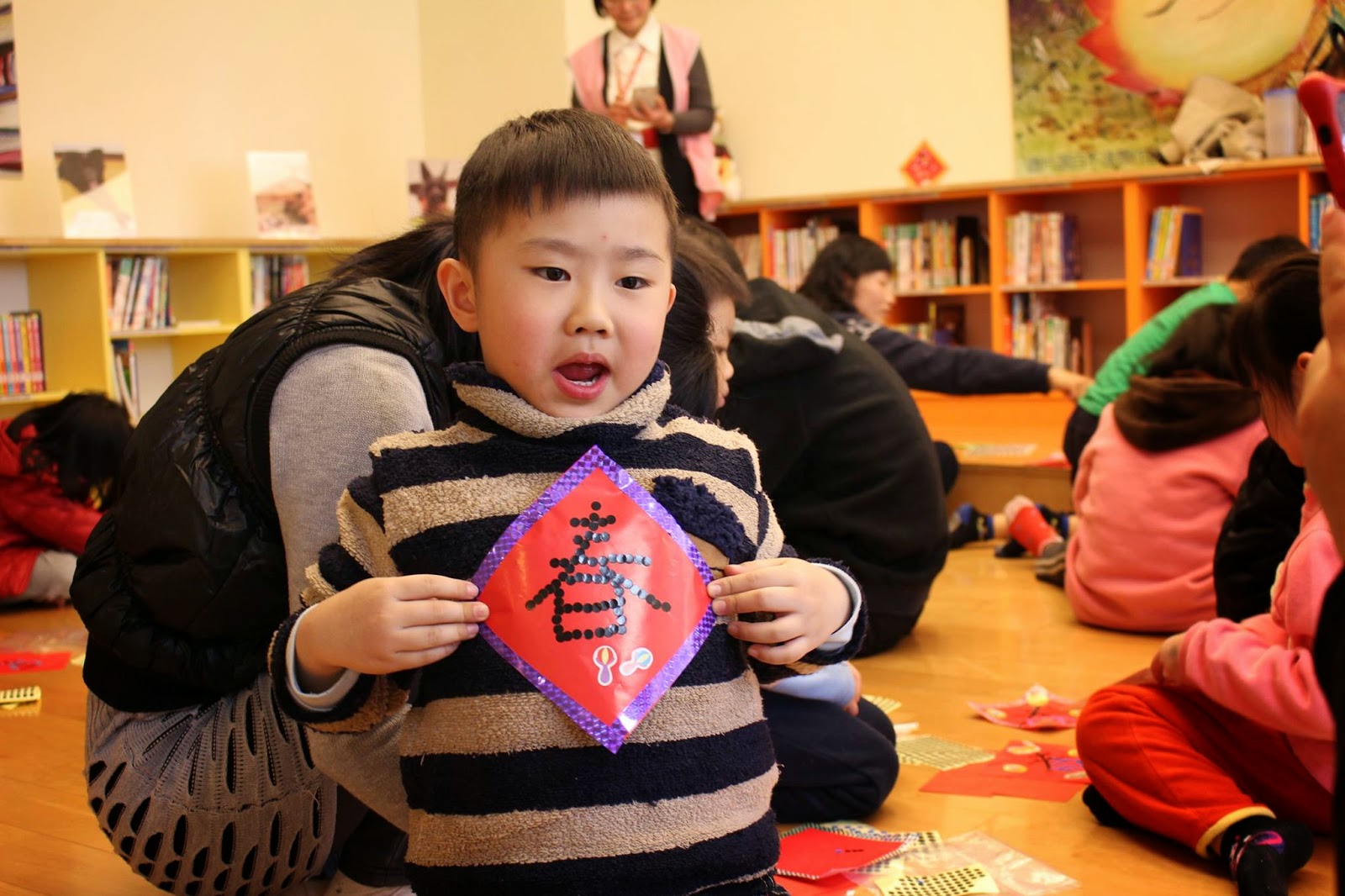 | ▲小朋友開心舉起做好的創意春聯。 攝影/劉怡馨 |
