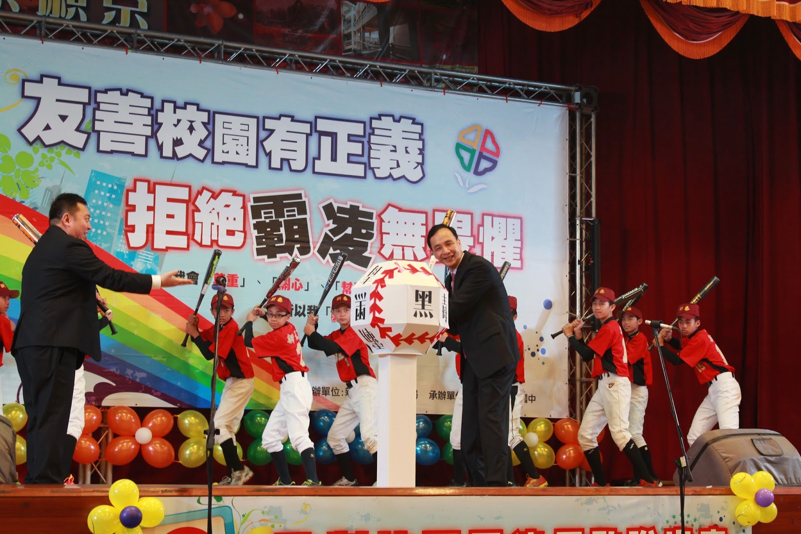 【記者傅韻芳報導】新泰國中二月廿六日舉辦反霸凌活動,新北市長朱立倫到場,與棒球隊學生一同在舞台上揮棒,將貼有「黑」字的造型紙球打擊出去,象徵把毒品、幫派、霸凌趕出校園。