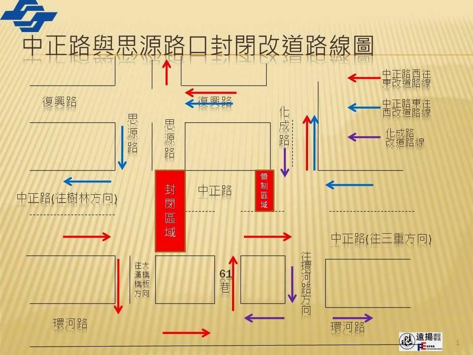 | ▲中正路與思源路口封閉改道路線圖。 照片提供/捷運工程局工程處土木工務 |