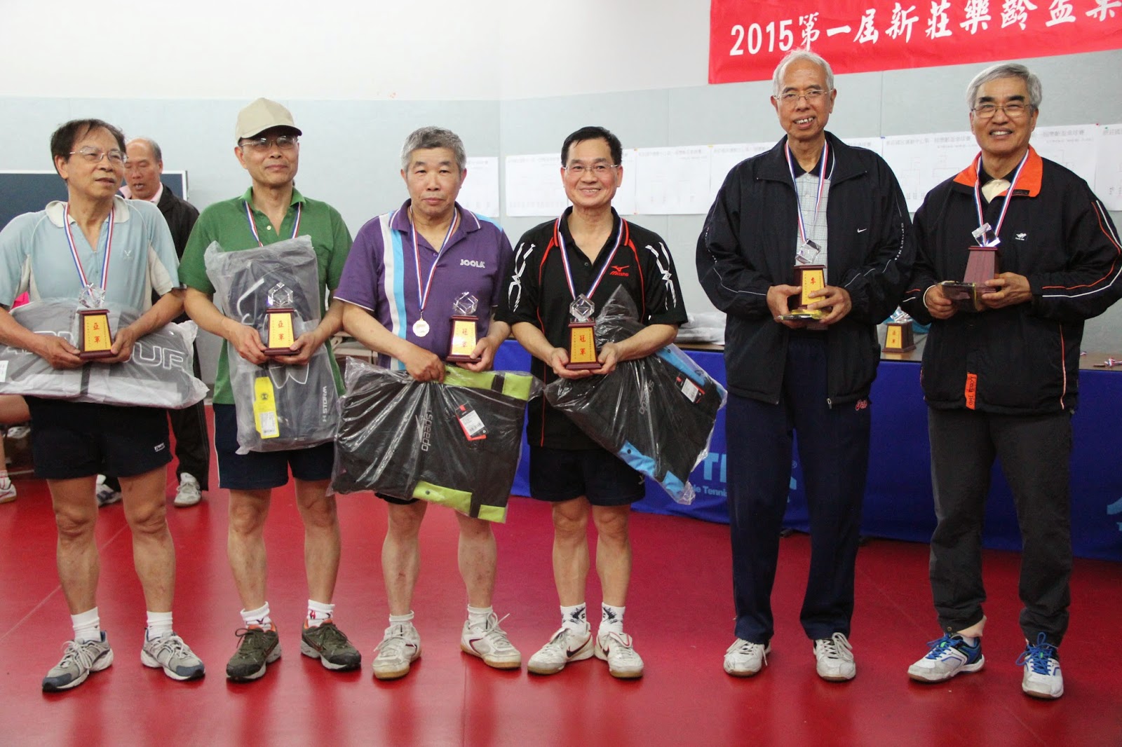 | ▲新莊樂齡盃桌球賽六十歲到六十九歲男子雙打組得獎者。 攝影/李宛庭 |