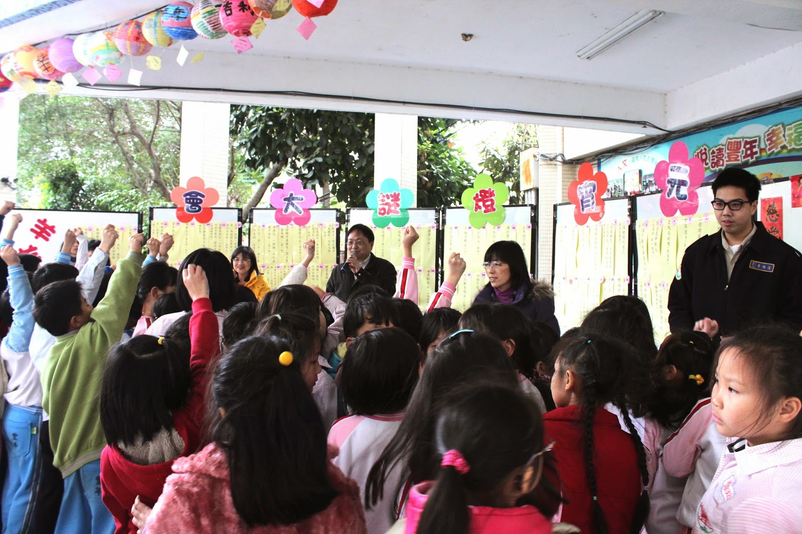 猜燈謎大會是豐年國小每年必舉辦的活動,校方表示為了避免活動造成混亂,今年學校把活動分成低、中、高年級分批進行,運用三節下課後十分鐘的休息時間讓學生參與猜燈謎。活動由老師發號施令,學生舉手搶答,被老師選到的學生可擇一燈謎作答,答對將獲得一支「亮亮筆」作為獎勵。 豐年國小校長柯明忠表示,低年級的學生參與度最高,「一,二年級的同學儘管不懂也都會舉手參與,相反較高年級的同學就沒低年級同學來得踴躍。」他認為猜燈謎既是中華傳統,又有娛樂的性質,是非常有意義的活動,希望藉此讓小朋友認識中國傳統習俗。