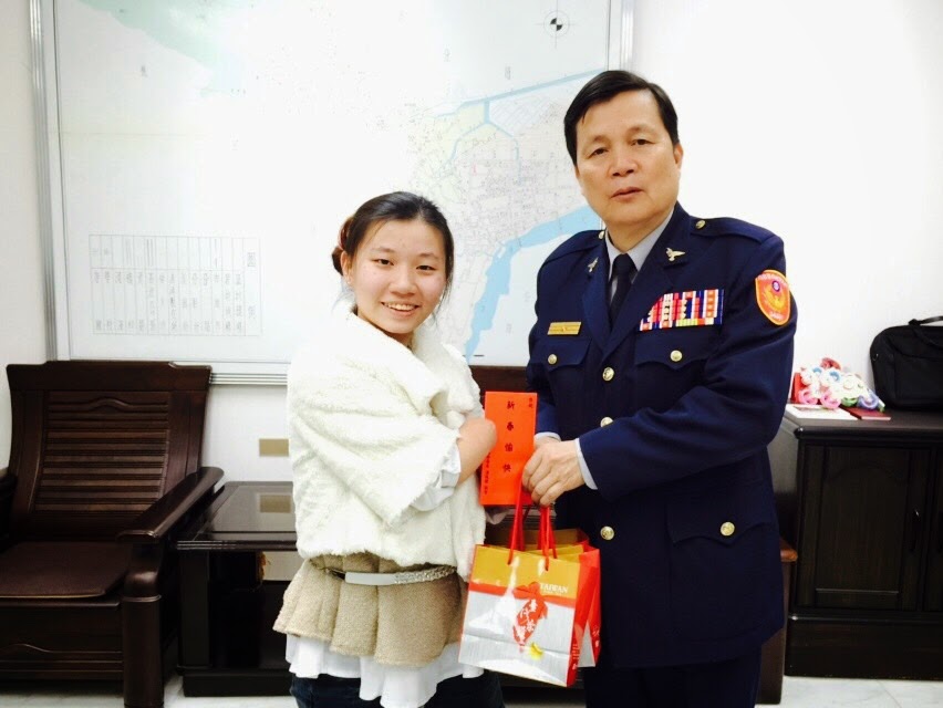 | ▲新莊分局分局長溫枝發向截肢女孩郭韋齊送上紅包及茶葉,以示祝福。 照片提供/新莊分局 |