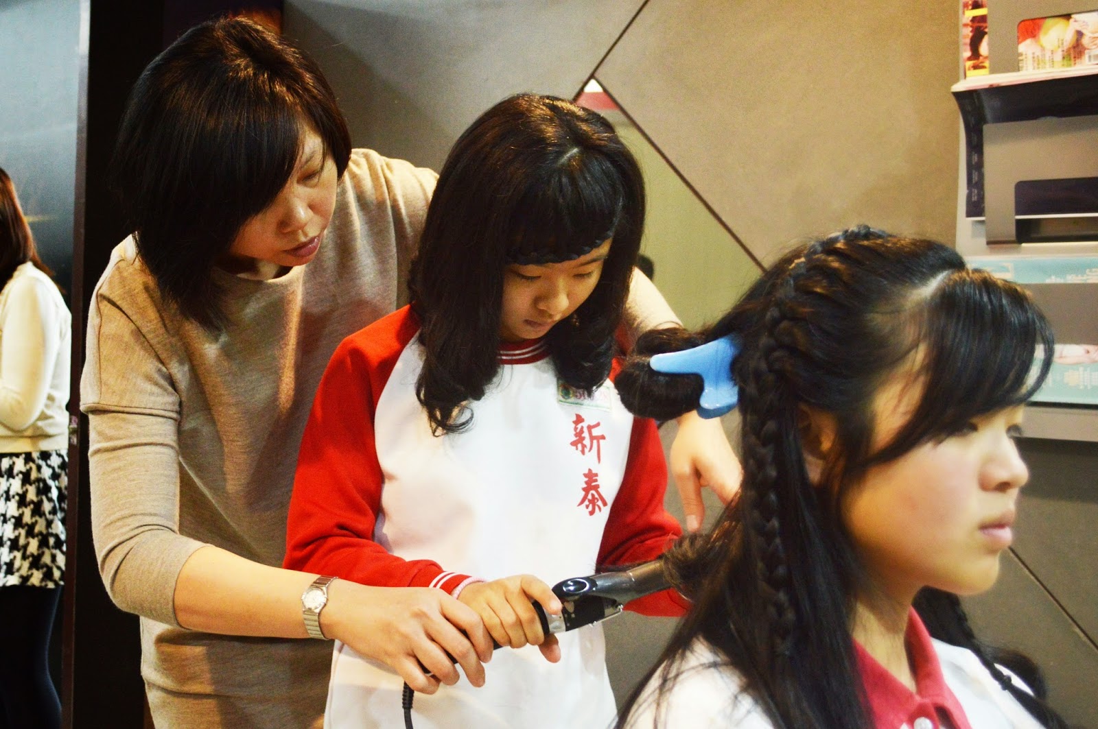 | ▲左為榖保家商時尚造型科教師教導新泰國小學生上美髮體驗課。 攝影/張佑任 |