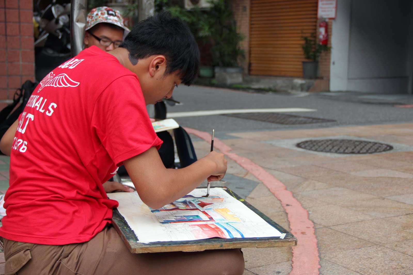 不分老女老幼,各自尋覓合適的地點,在路旁畫起他們眼前的老街樣貌。也有沒學過繪畫的媽媽,跟著小孩一同來老街嘗試初次寫生。更多的是美術相關科系的學生。來自桃園的高中生林郁晉說:「我是簡老師的學生。但這次活動是我自己報名的,一方面自己是美術科系,另一方面是對畫畫、寫生真的感興趣。」
