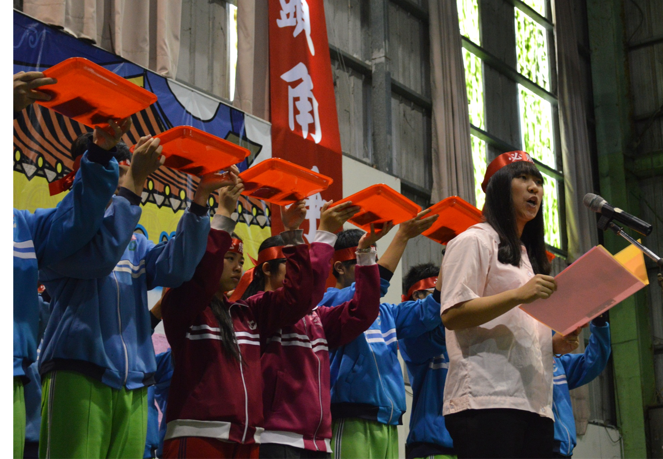 「頭角崢嶸題金榜,前途似錦展長才」,紅底白字的對聯巧妙的運用校名-「頭」和「前」作為首字,高高的掛在舞台上。早上七時五十五分,祈福典禮以強而有力的擊鼓聲揭開序幕,由九年級各班班長拿著印有全班拇指印的祝福卡上台,貼在金榜題名的祈願牆上,象徵每一位考生都是被祝福的。