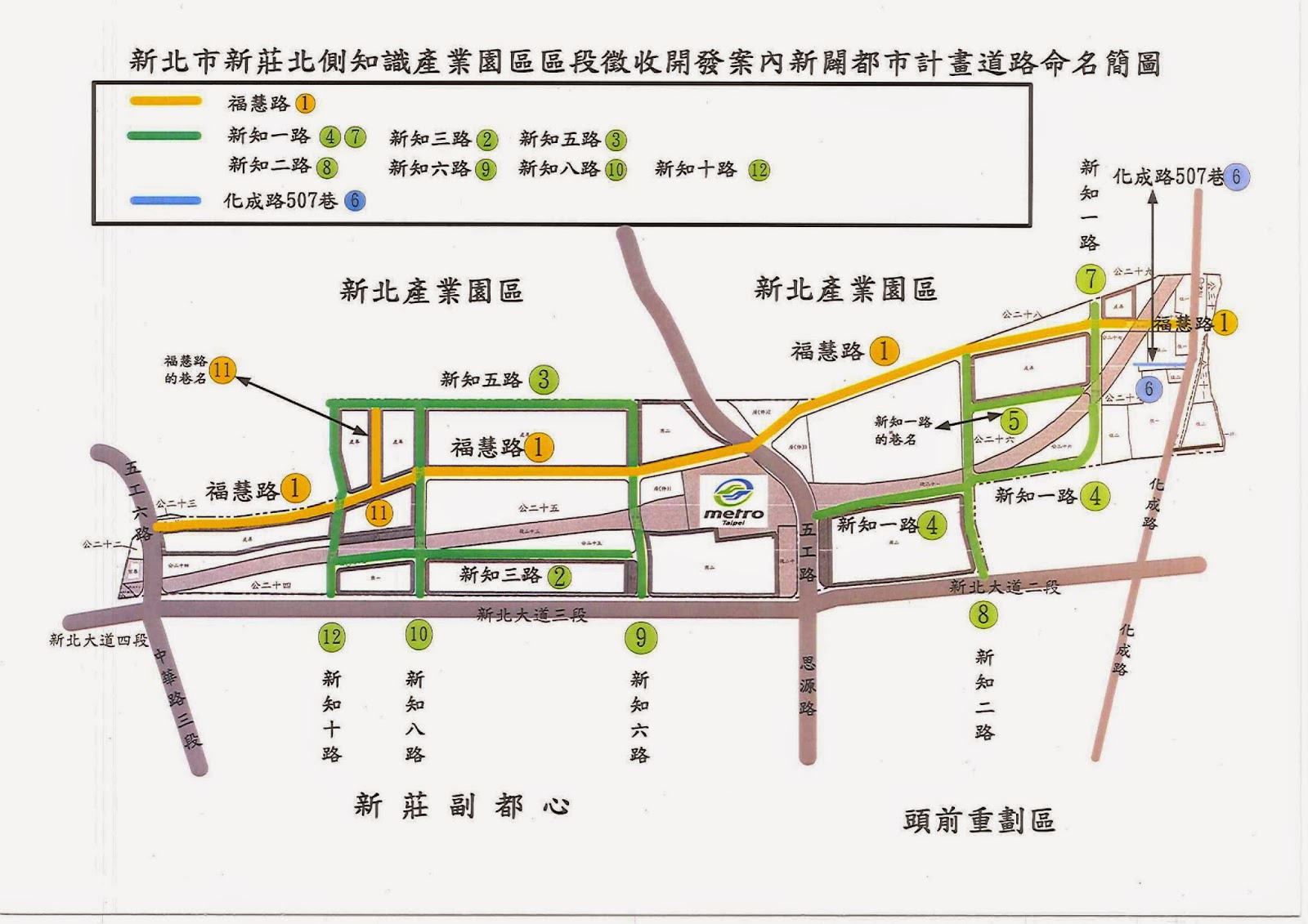 新莊北側知識產業園區,是新北市政府一○○年開始推動的「五星開發計畫」之一。一○三年五月動工後,市府在今年四月十七日公告園區內新闢道路名稱。分別是:福慧路、新知一路、二路、三路、五路、六路、八路、十路。另外有三條道路,因長度或寬度不合標準,依照道路相接的門牌次序編定巷號。