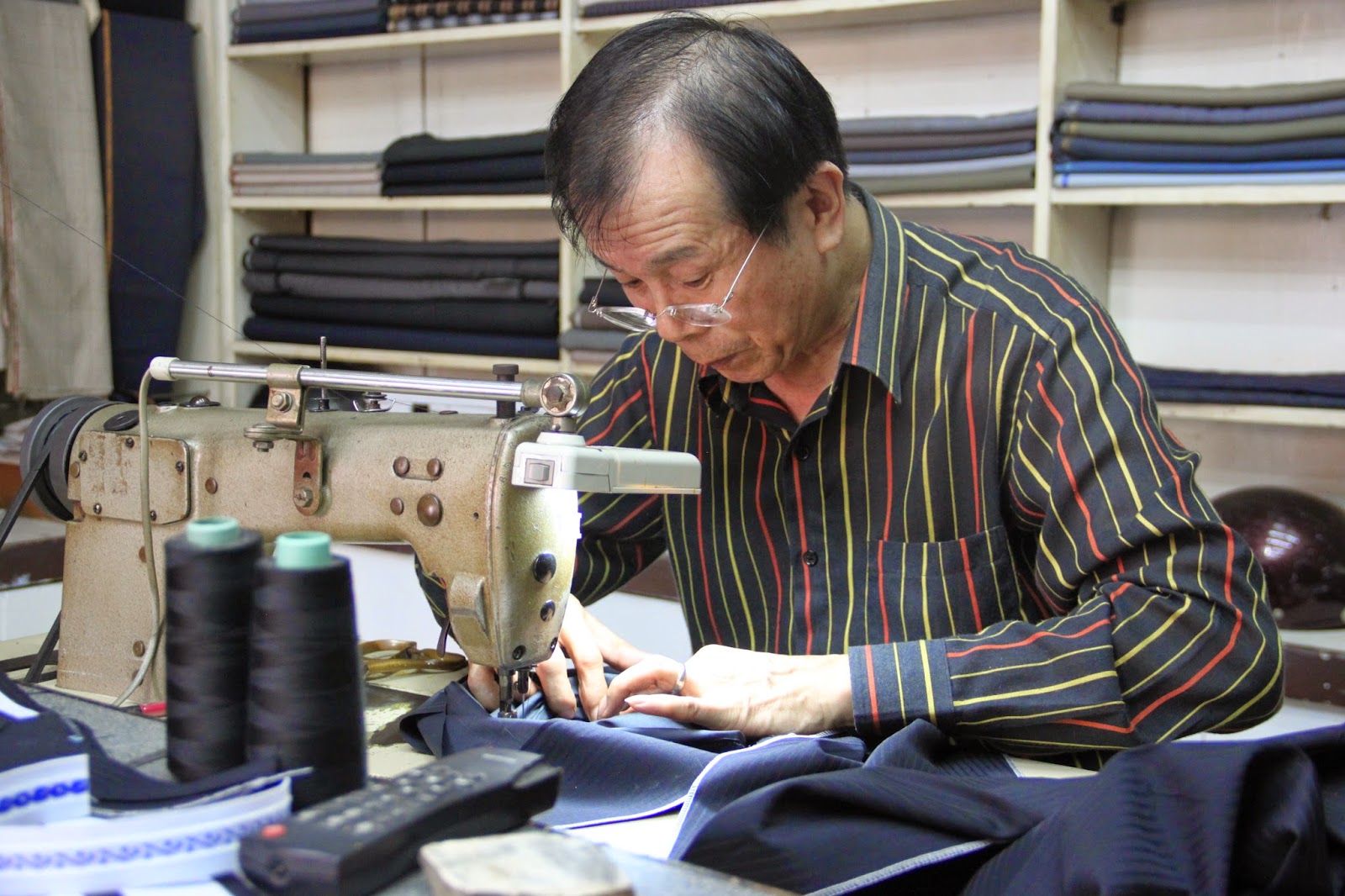 ▲日新西服店老闆丁忠村已年過六旬,仍精於細活,修改西裝的