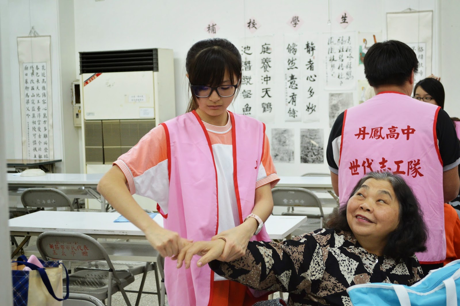 ▲丹鳳國中世代志工服務社社員替豐年國小樂齡志工社長輩