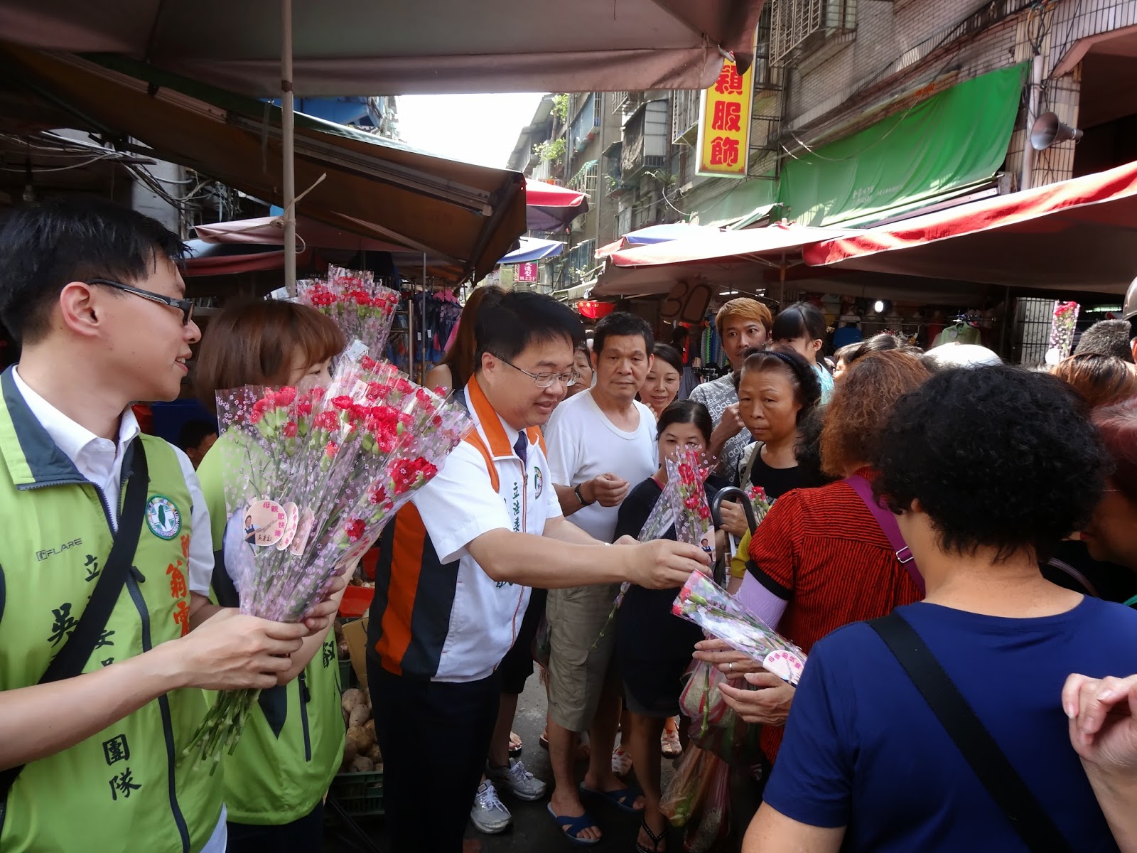 中)至新莊四維市場發送康乃馨,祝各位媽媽母親節快樂。