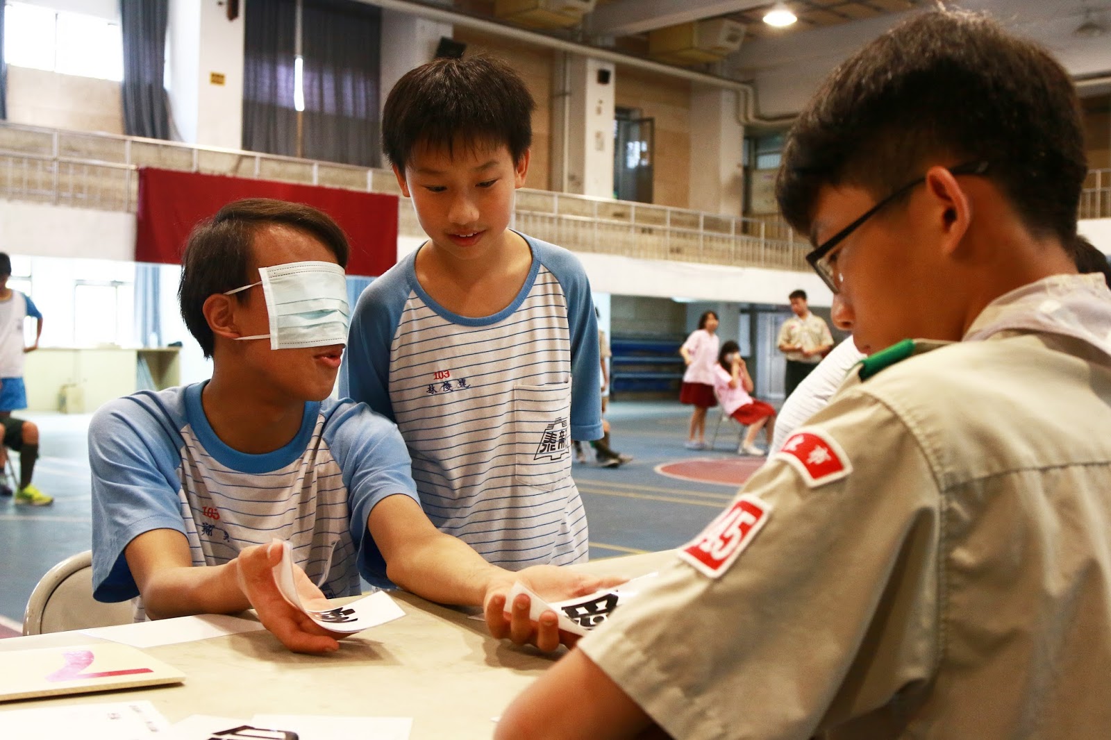 | ▲左邊學生眼睛被矇住扮演盲人,中間學生用口頭指引上下左右要 翻哪張牌子,右邊童軍為工作人員。 攝影/葉政勳 |