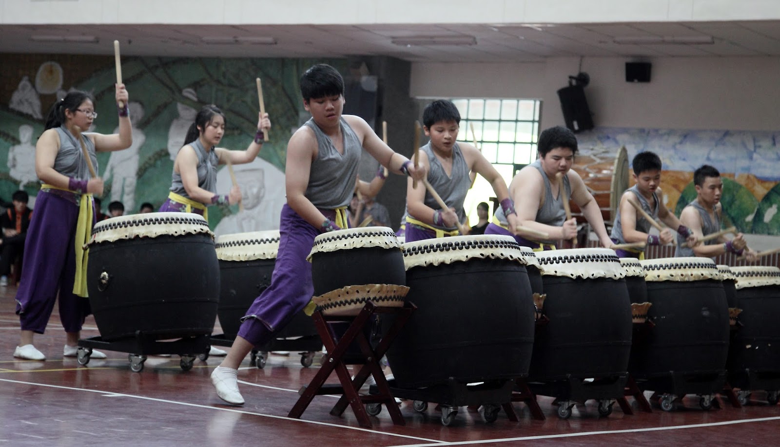 「擊鼓是一個很講求團隊合作、默契的運動!」八年八班的陳冠豪認真的說,國中的鼓比小學高,也新增了「旋風腿」等新的招式,「教練真的很用心、辛苦的帶領我們,在訓練的時候很嚴格要求基本功,私底下卻像自己的家人一樣。」