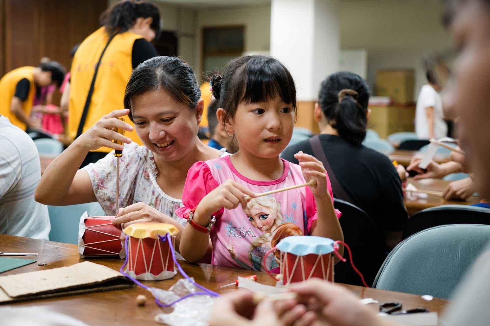 相比去年,今年的「鼓玩意DIY課程」簡易了許多。劉昱光表示,由於去年有人受傷,今年的活動更注意「安全」和「有趣」,志工不僅對小鼓的設計做了改變,也格外警惕,「稍微看到小朋友哪裡怪怪的,就會跑過去幫忙」。
