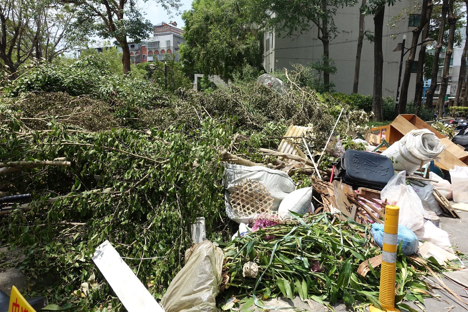 ▲思賢公園被吹落的樹枝及障礙物已先安置在一旁以免