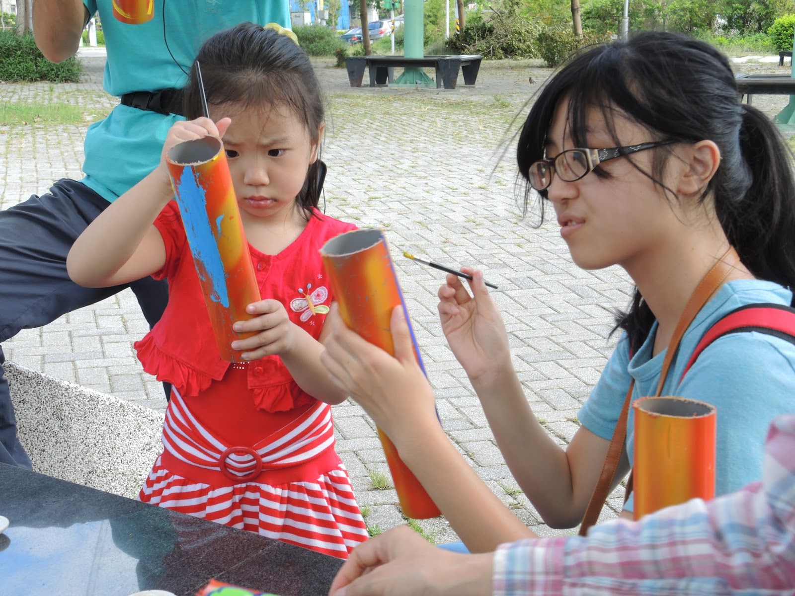 ▲參與濕地導覽活動的團員彩繪護樹環,以保護園內復