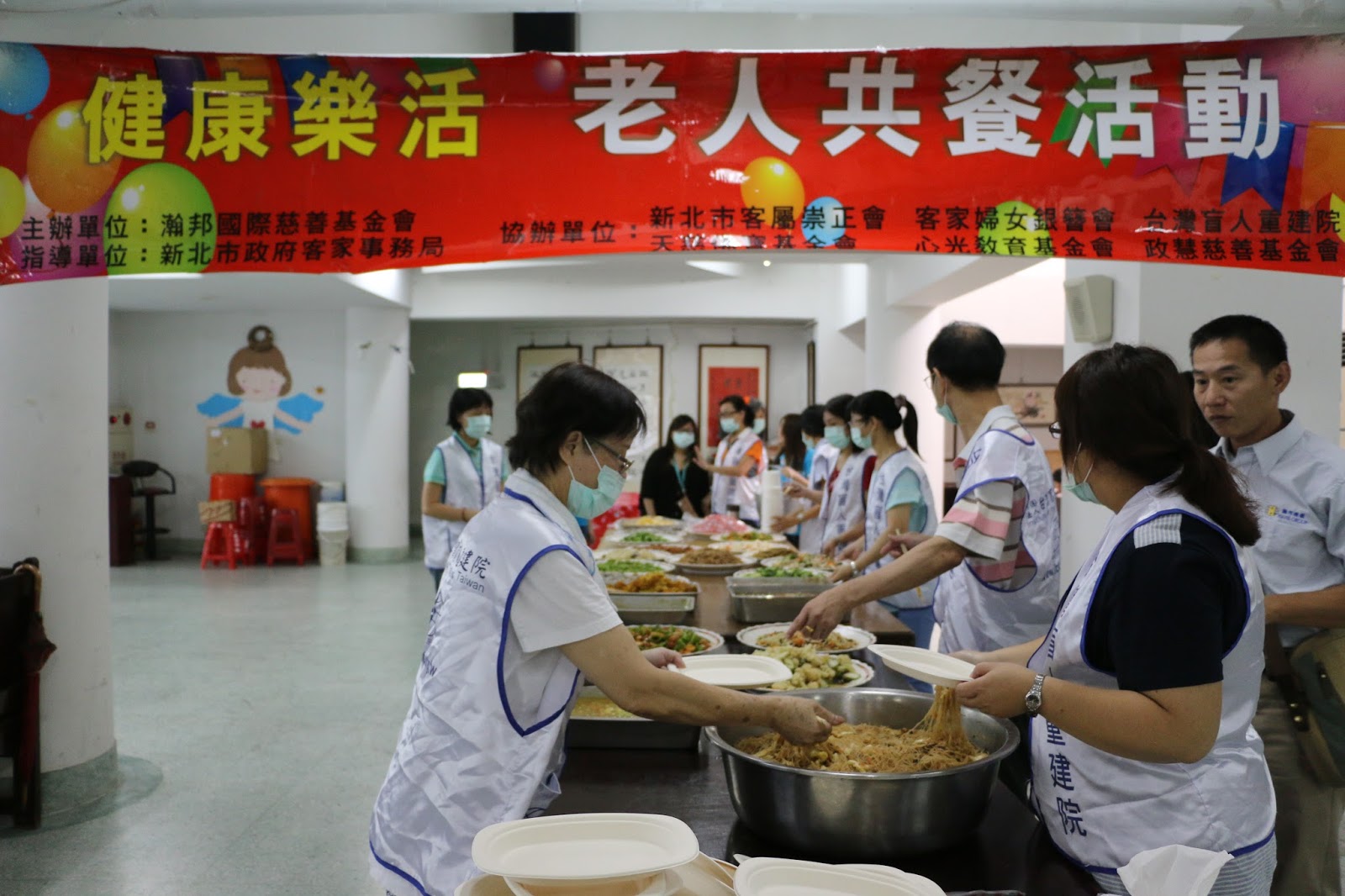 當天接連父親節慶祝活動及盲人輔助員的結訓典禮,參與共餐人數約有五十人。共餐活動常常搭配一些表演及課程,課程內容多半為老人照護及保健視力等項目,餐點也經過精心設計,主辦單位瀚邦基金會董事長曾梁源說,這邊的餐色都有經過營養調配,都是以素食為主,外面絕對沒有這麼精緻。