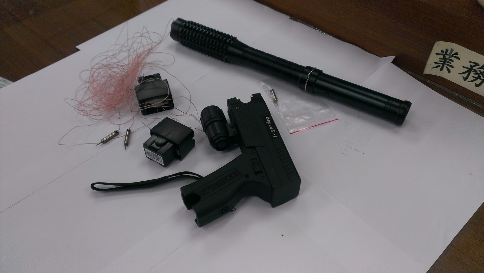 | ▲四名兇嫌使用的電擊槍、電擊棒等管制武器。 攝影/王俊傑 |