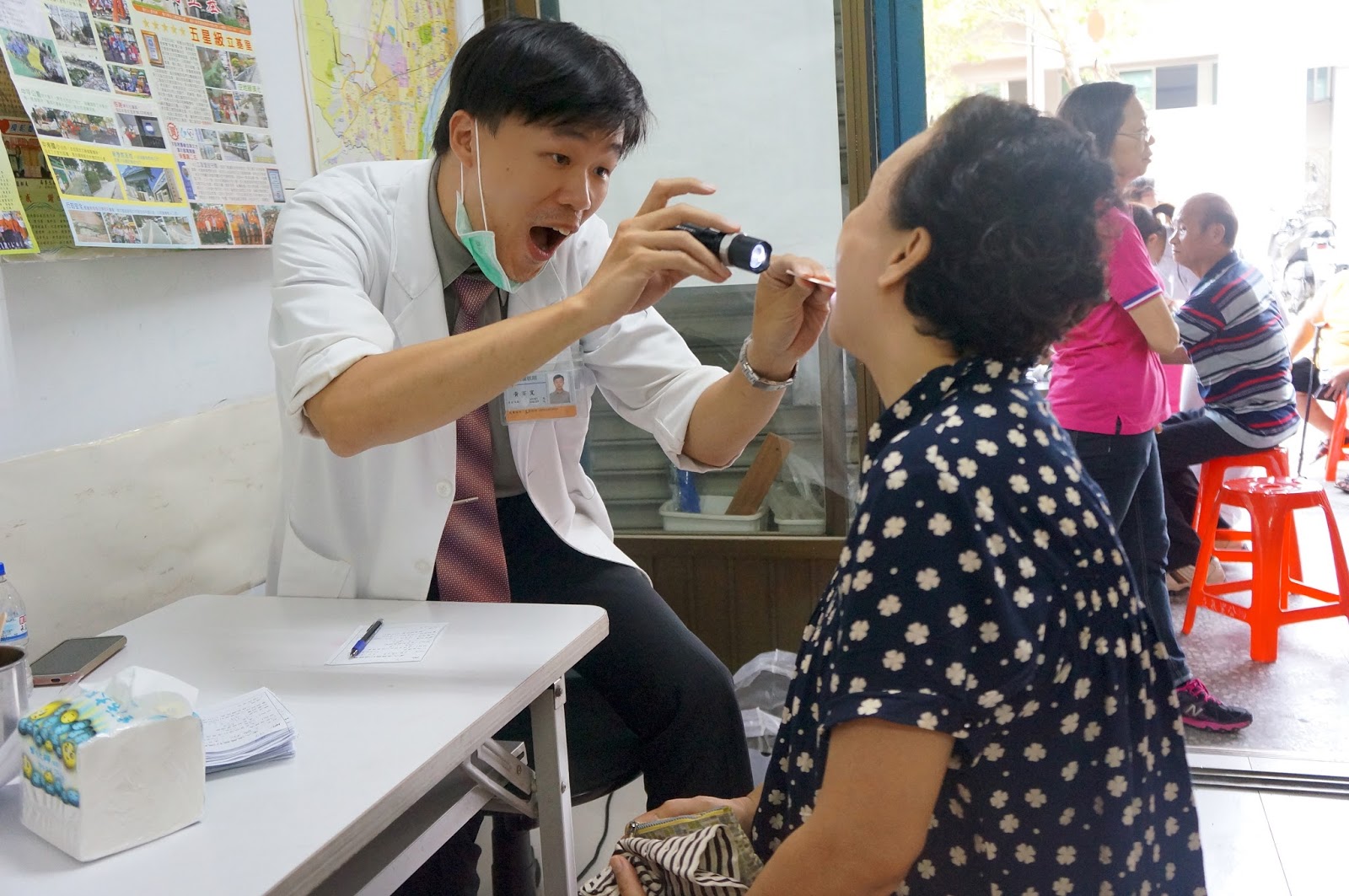 ▲黃百寬醫師(左)在為里民接種疫苗前,進行例行的