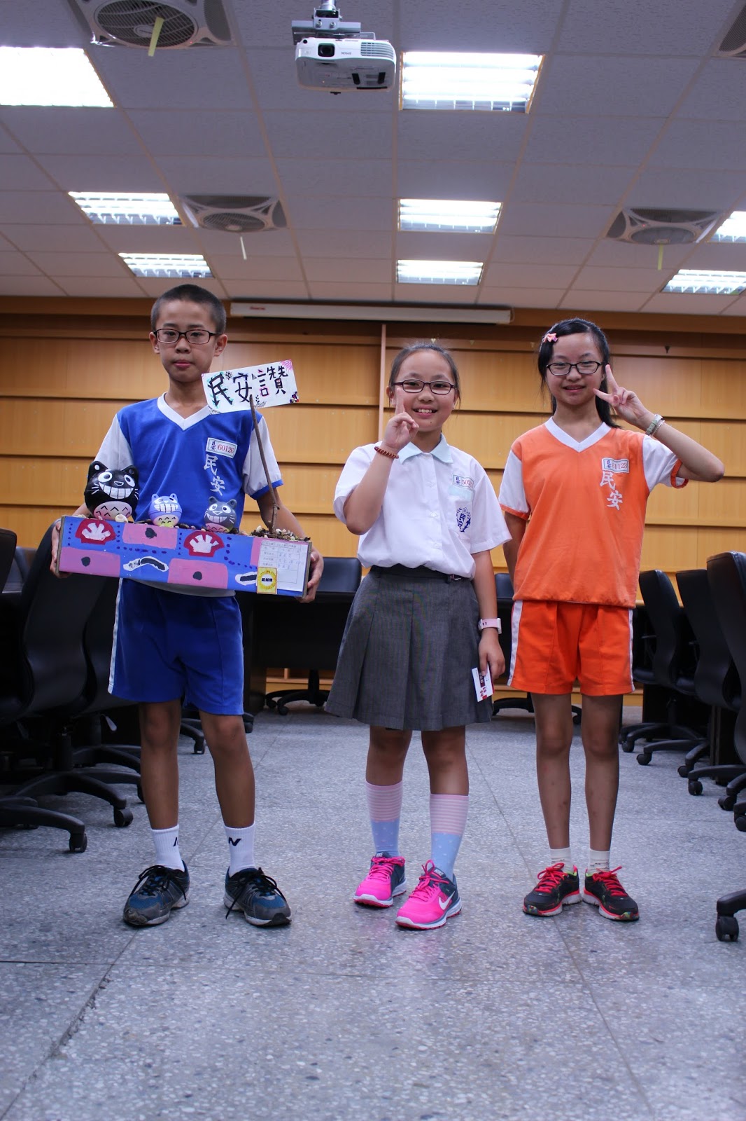 六年一班黃威閎的作品「民安站,民安讚」被校長選為超越獎得主。黃威閎用三顆廢棄的浮球做出三隻龍貓公仔,無論是無辜的眼神或是胖嘟嘟的身軀都很到位,旁邊插上「民安讚」的牌子,就像動畫電影「龍貓」中,龍貓站在公車站牌邊的畫面。