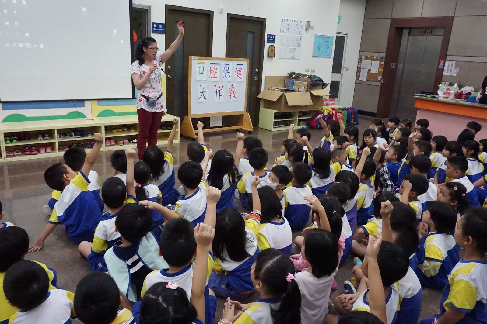 園長鍾素翎表示,學期初會訂出一整學年的主題,利用晨光時間每周規劃不同課程,例如:將防災演練、登革熱防治、口腔保健等議題加上戲劇、簡報、影片播放或是故事分享的方式,吸引孩童興趣,進而把教育落實在生活中。