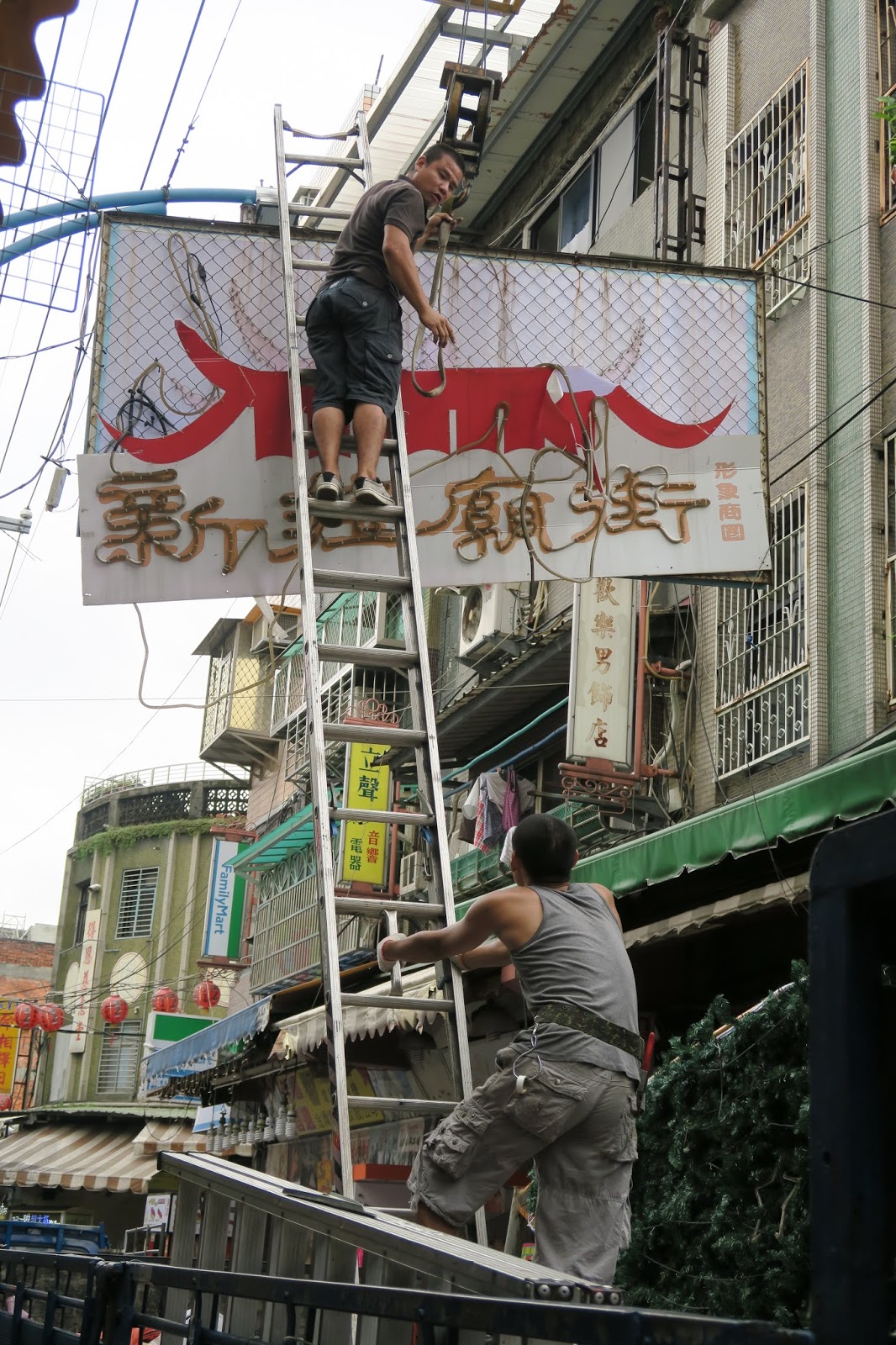 | ▲工程人員在新莊廟街拆除街燈和招牌。 攝影/陳韻如 |