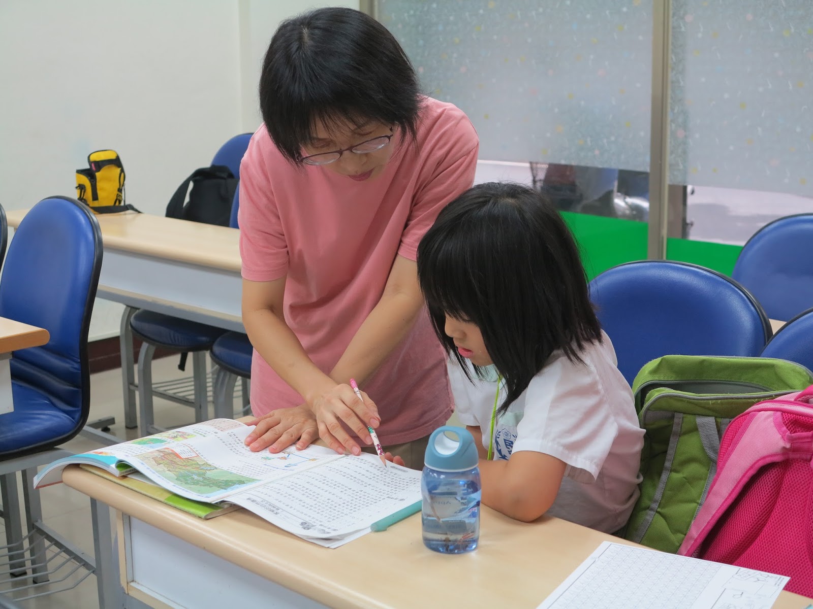 迦勒課輔班的莊惠老師受訪時,正好是孩子做功課的時間。她一位一位地悉心教導,即使孩子寫錯了也不會責罵,反而輕聲地說「沒關係,我們再試一次」,當孩子們做對了更是連聲地讚美。
