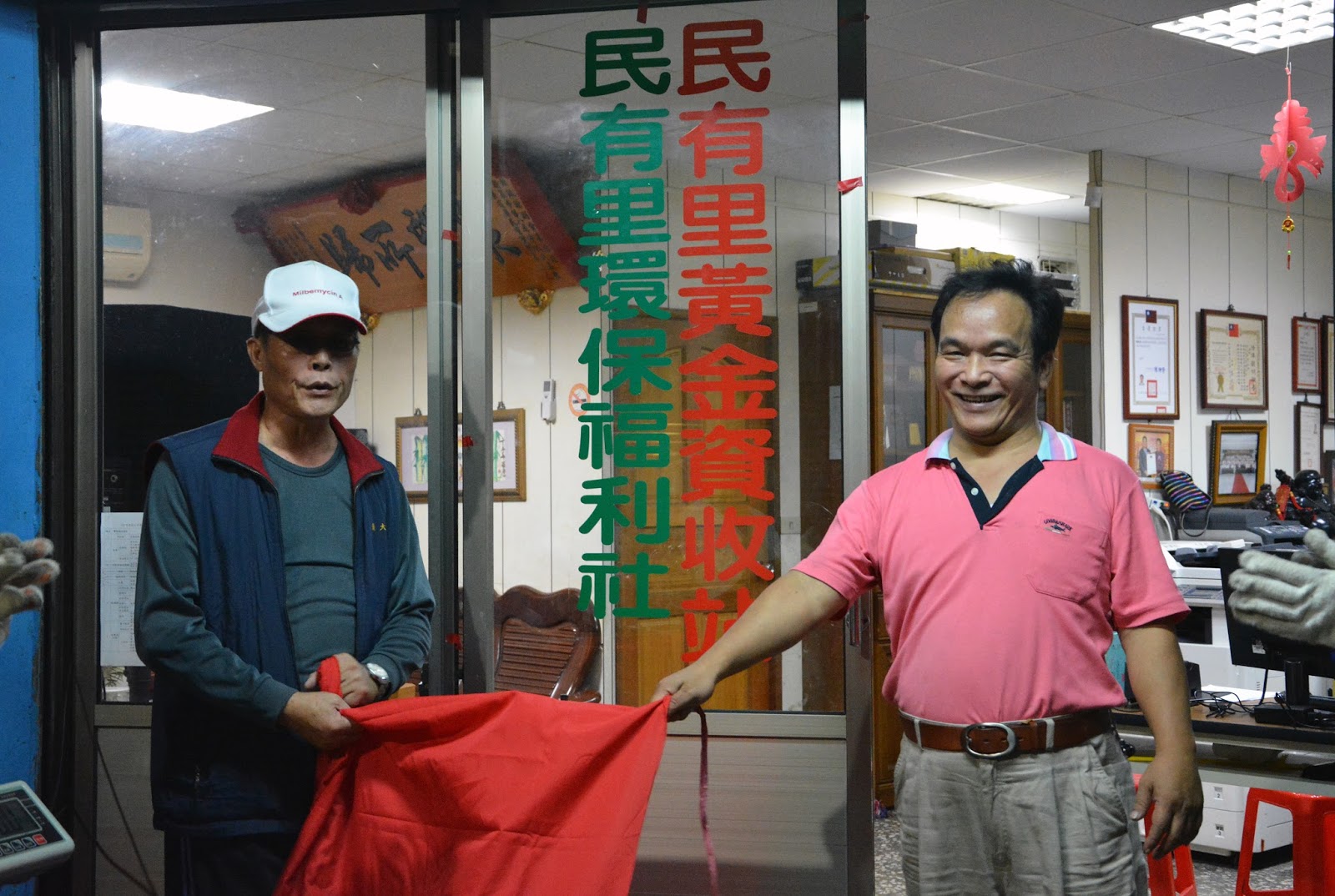▲民有里里長賴政源(圖左)為民有里環保福利社揭幕。攝影/張絲雨