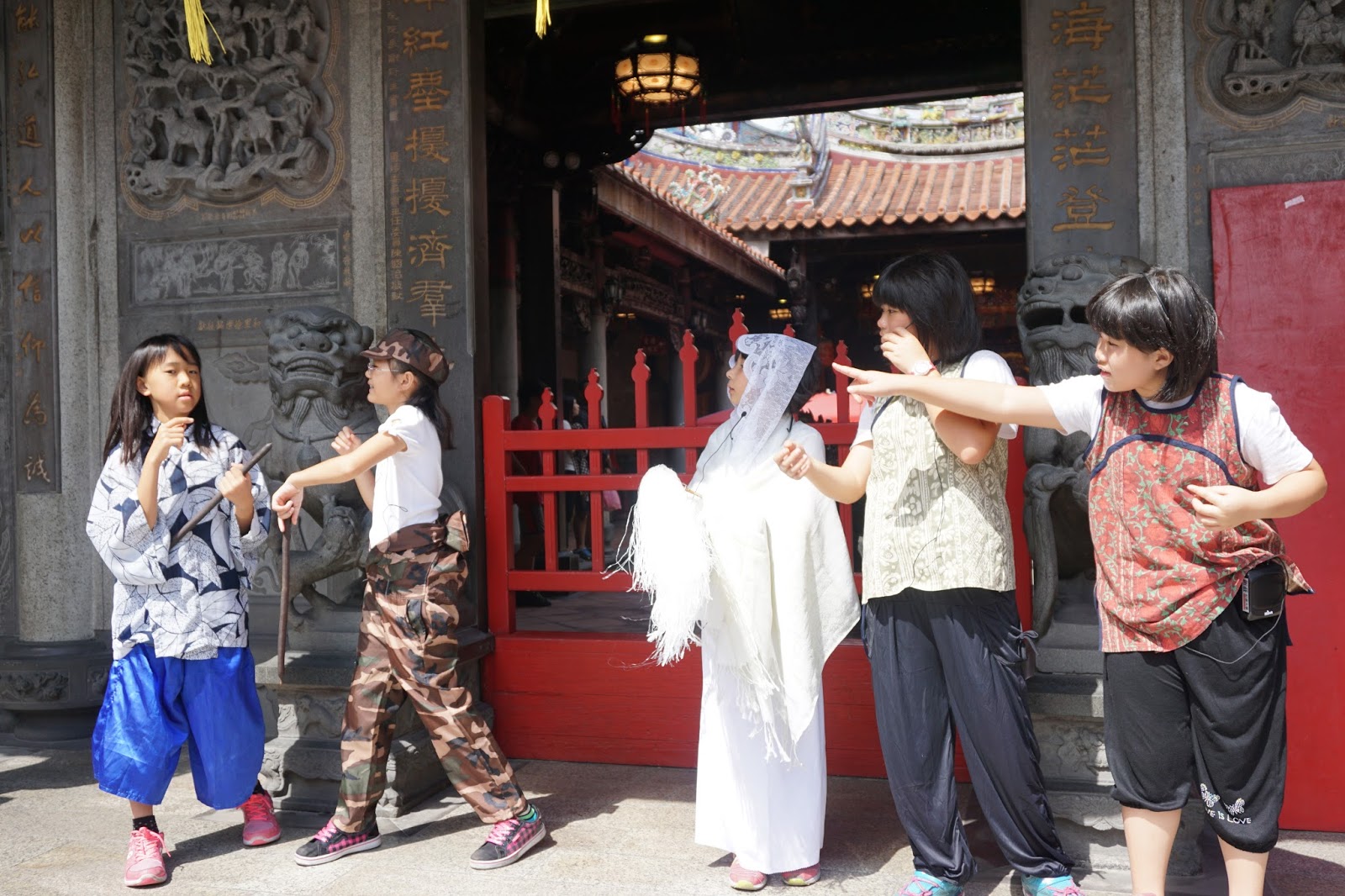 ▲參與社大暑期課程的小學生在慈祐宮前用演戲方式詮釋新莊的歷史。