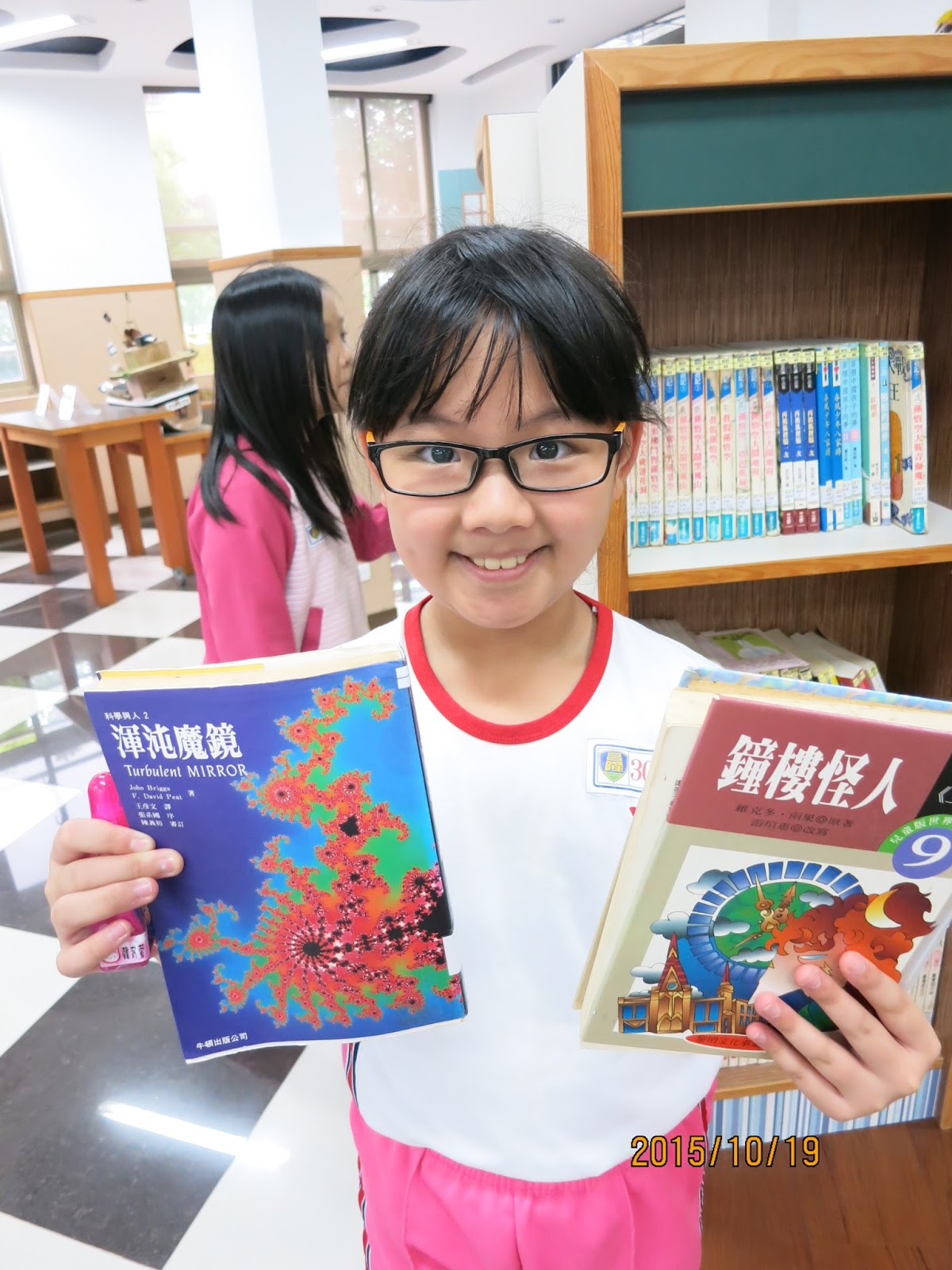 ▲學生開心拿著有「魔」與「怪」字書籍一起合影。