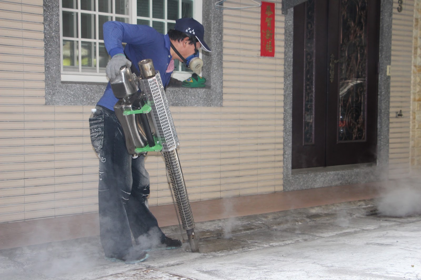 陳通助說:「光正里每年都會跟新莊區公所申請環境噴藥,一年會噴灑六次,這次是今年第五次消毒。所有可能會有蚊蟲孳生的地方都要噴灑,就連地下停車場也要徹底消毒。」