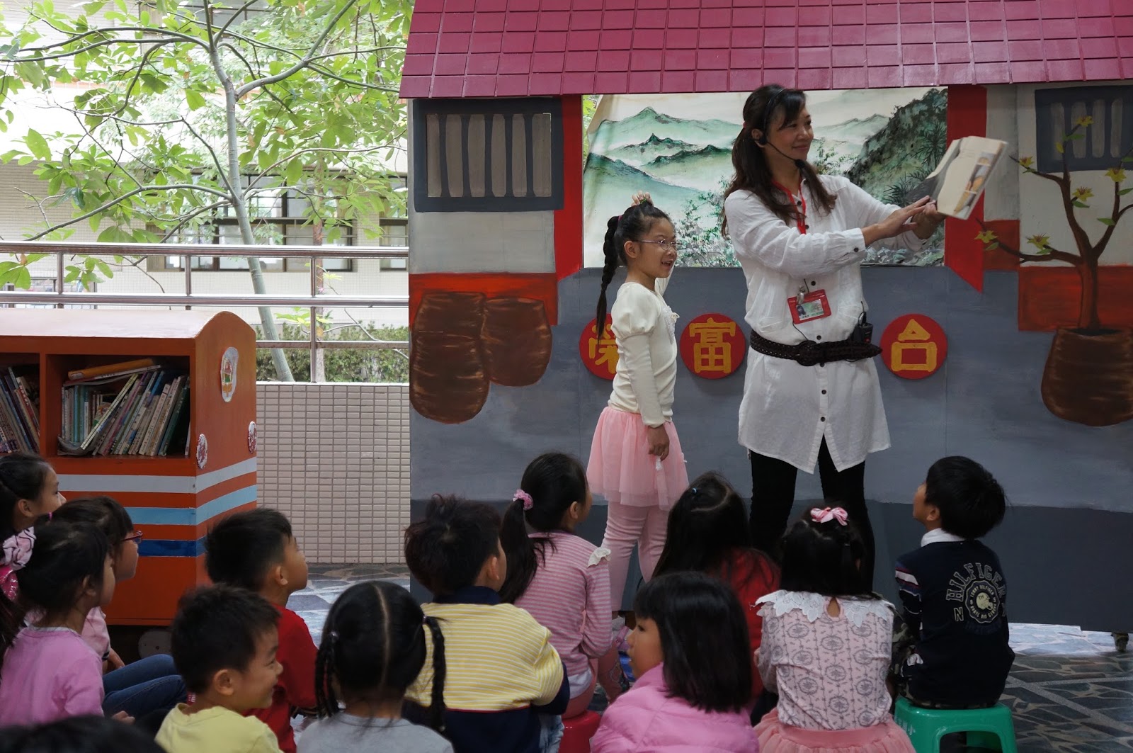 【記者王芸樣特稿】「你們猜猜最後的結局是什麼?」榮富國小中文故事團故事媽媽林梅香十一月十一日一大早,在校園大廳的「榮富戲台」前,手拿繪本聲色俱佳的說。身旁站著二年八班的女兒鍾蕎安,兩人一起「說故事」,迎接充實的一天。